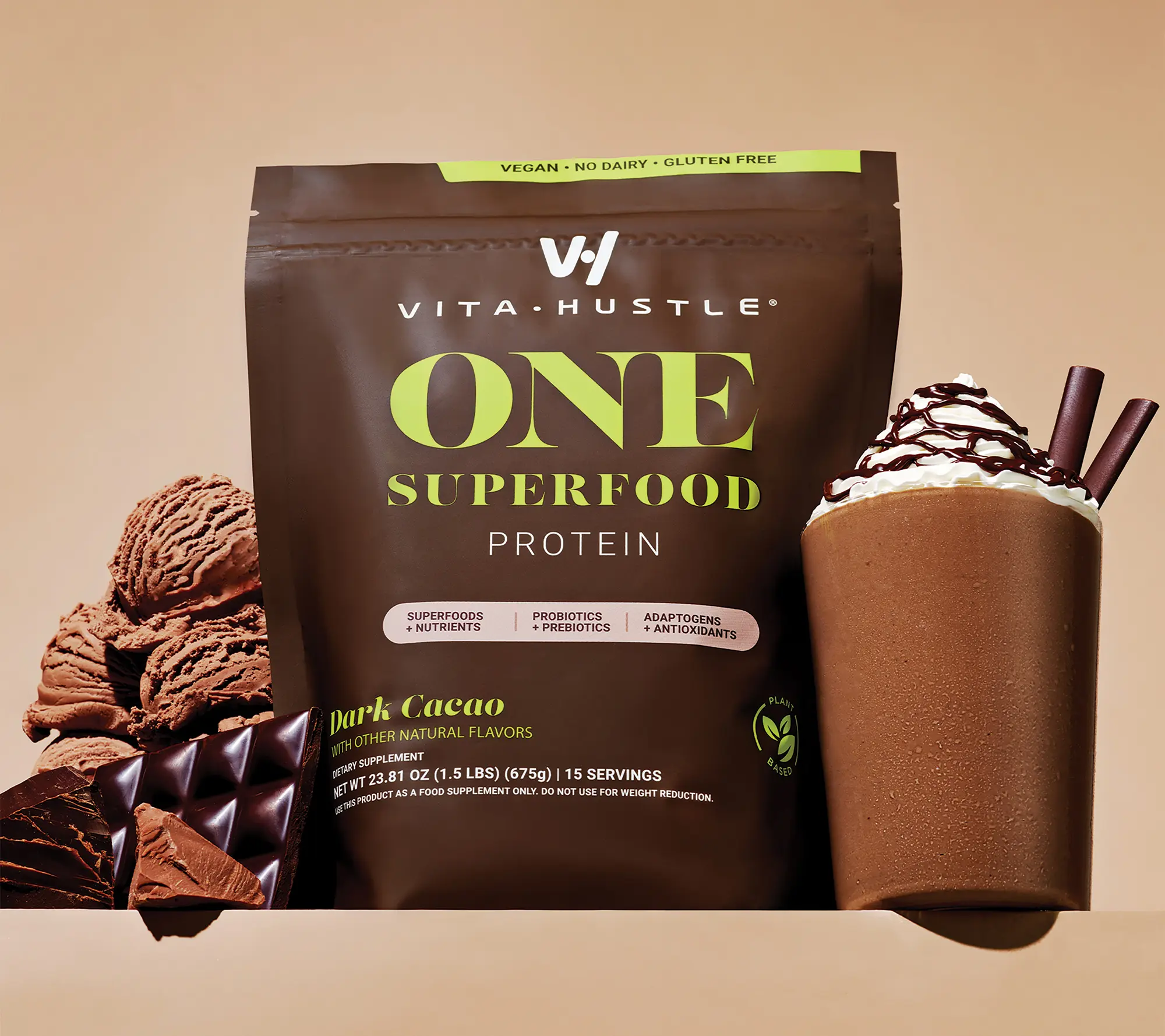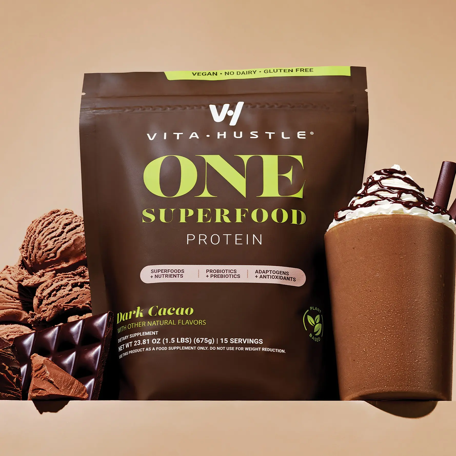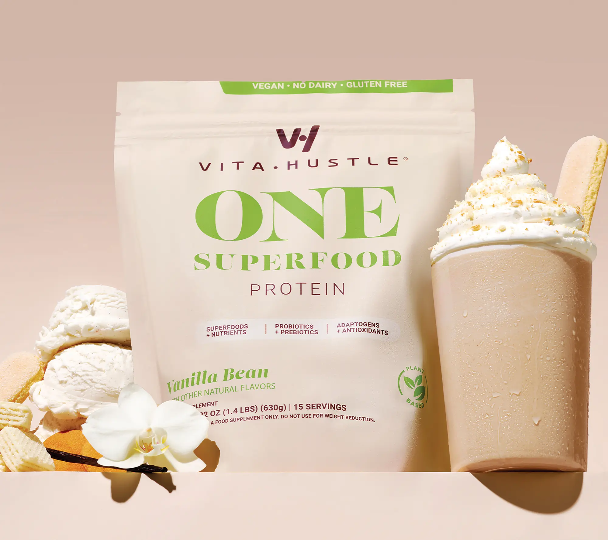 ·Includes 15-serving bag of VitaHustle ONE Superfood Protein Shake