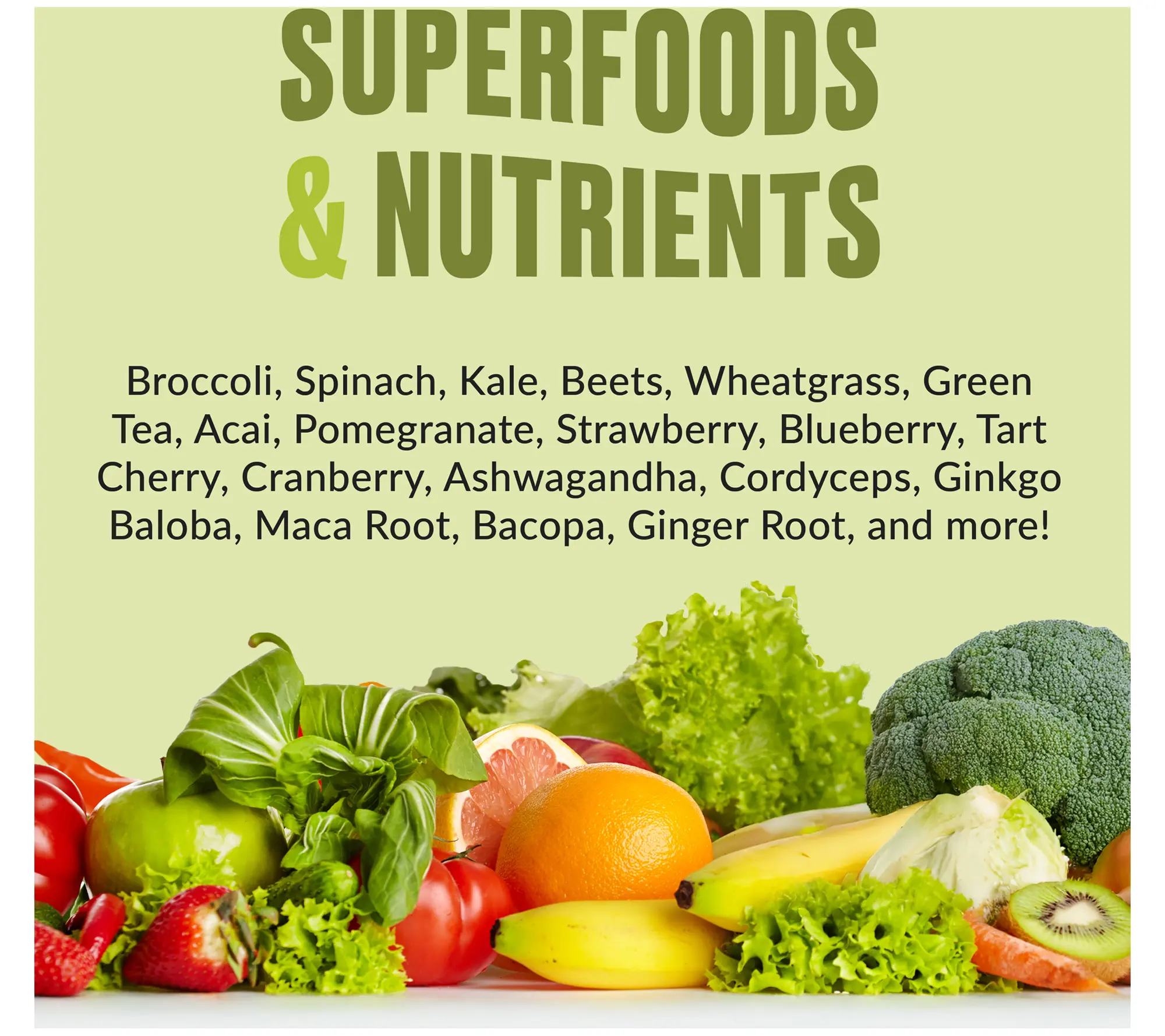 ·Made with broccoli, spinach, kale, beets, wheatgrass, green tea, acai, pomegranate, strawberry, blueberry, tart cherry, cranberry, ashwagandha, cordyceps, ginkgo baloba, maca root, bacopa, and ginger root