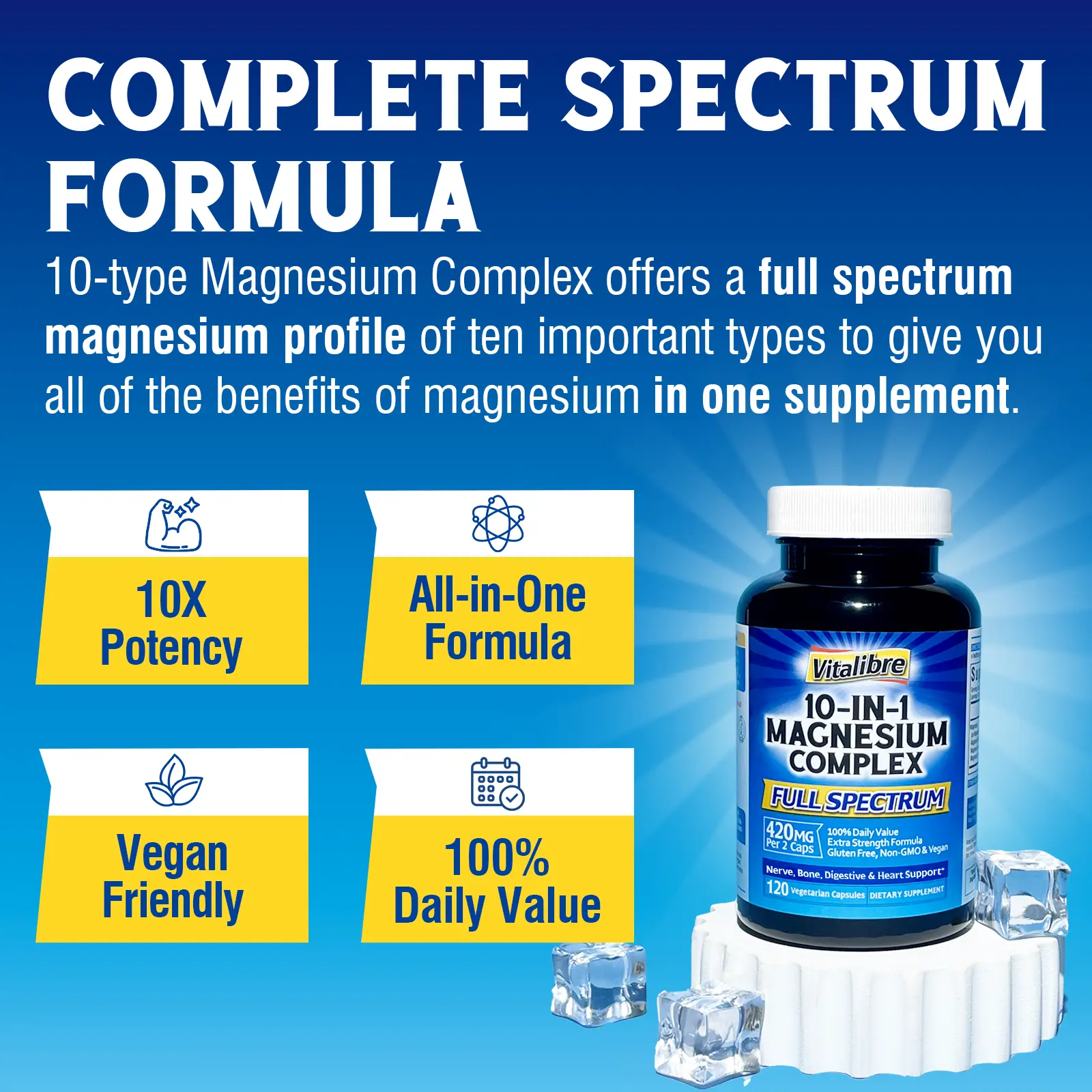 Vitalibre 10-in-1 Magnesium Complex offers a full spectrum magnesium profile of ten important types - glycinate, citrate, taurate, gluconate, malate, oxide, lactate, aspartate, succinate, and orotate formulated to give you all of the benefits of magnesium in one supplement. It provides comprehensive health support for nerve, bone, muscle, digestive, heart and brain health.*
