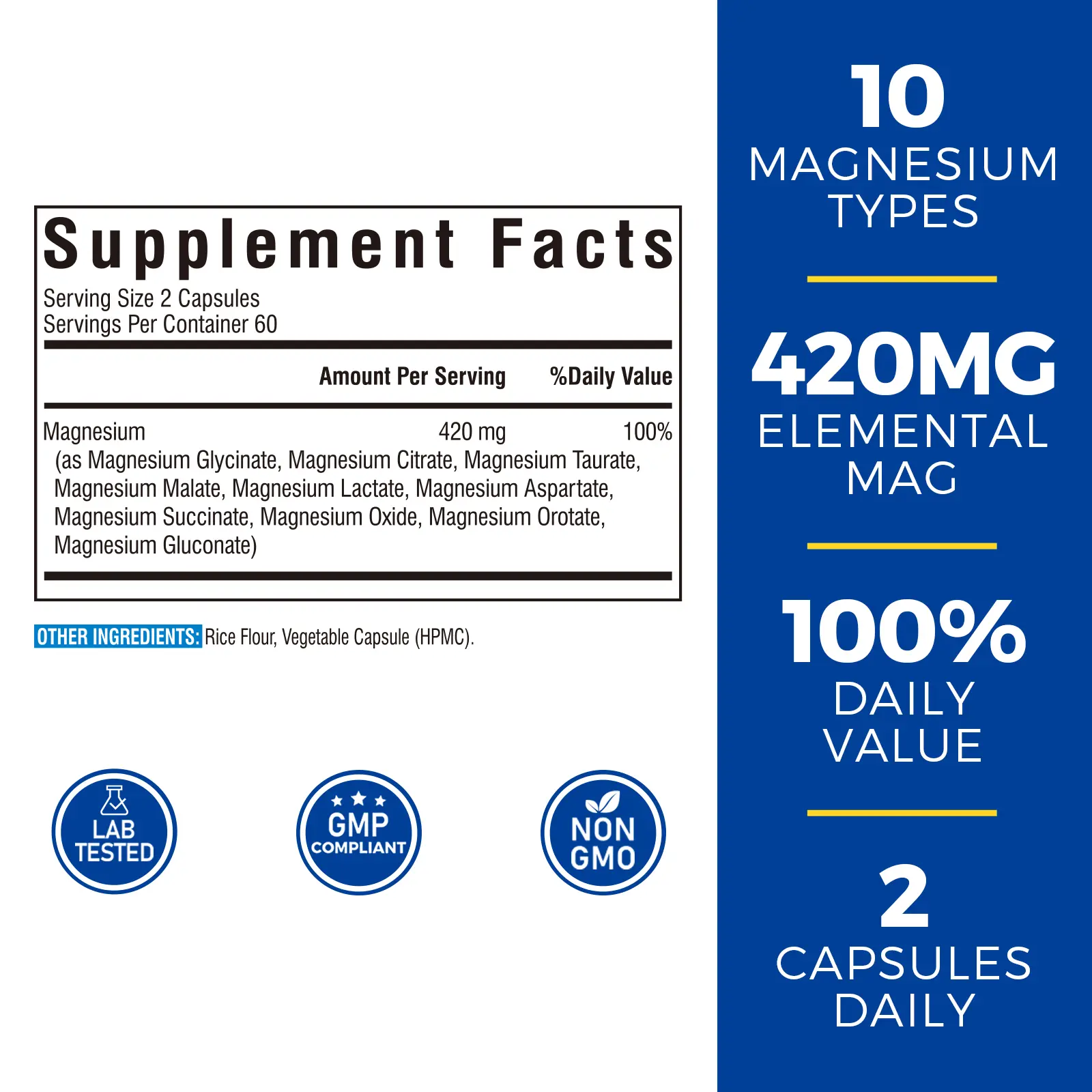 420mg Elemental Magnesium (100% Daily Recommended Value)