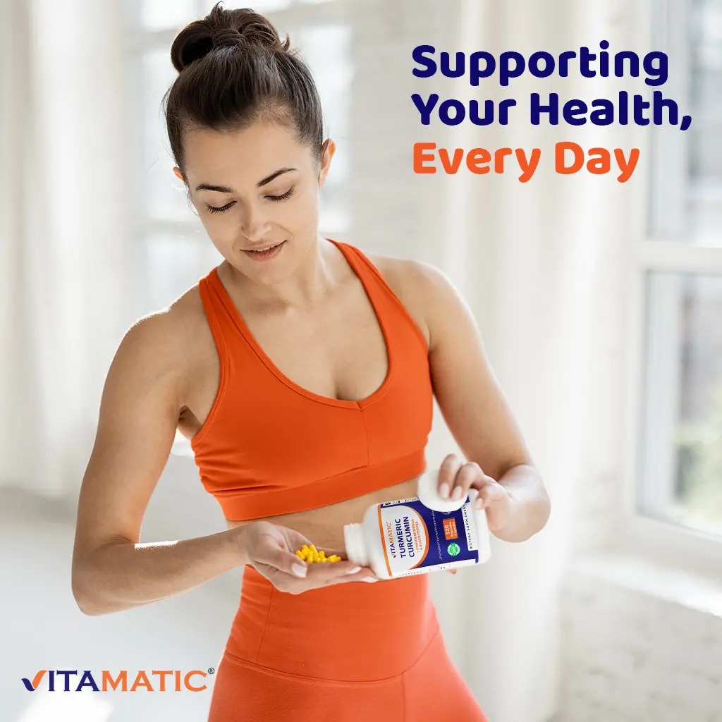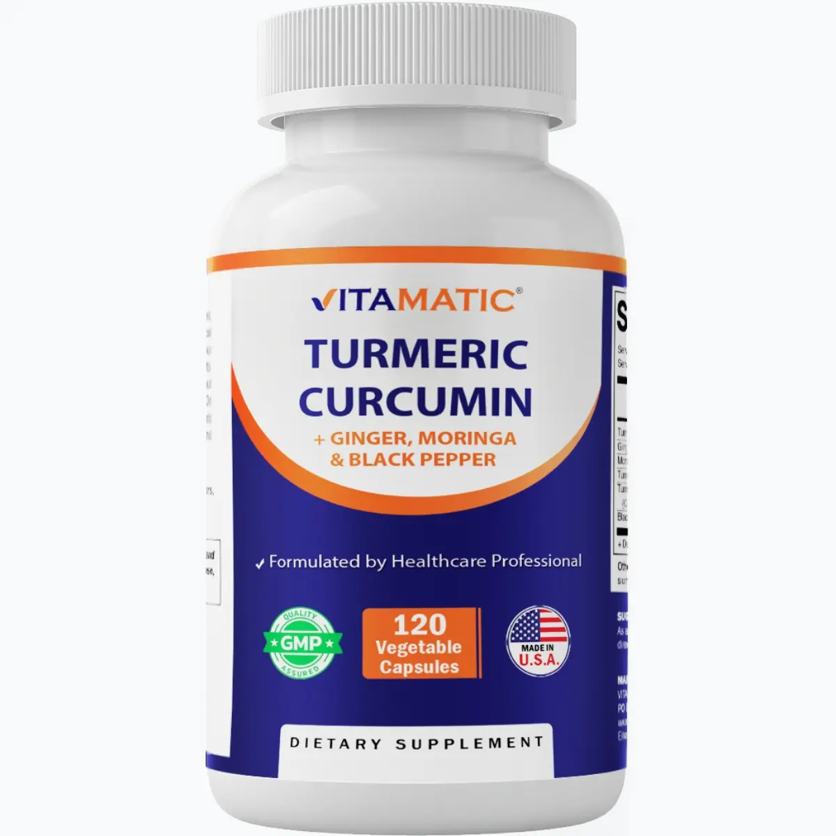 Vitamatic Turmeric Curcumin 3000mg 95% Curcuminoids with Black Pepper Ginger Moringa 120 Vegetable Capsules is a non-GMO, gluten-free dietary supplement designed for overall health and wellness. It combines turmeric, ginger, and moringa for potent anti-inflammatory and antioxidant benefits. Enhanced with black pepper for better absorption, it is ideal for those seeking natural support for joint health, improved digestion, and enhanced immune health. This plant-based supplement is made in the USA and comes with 120 capsules per bottle.