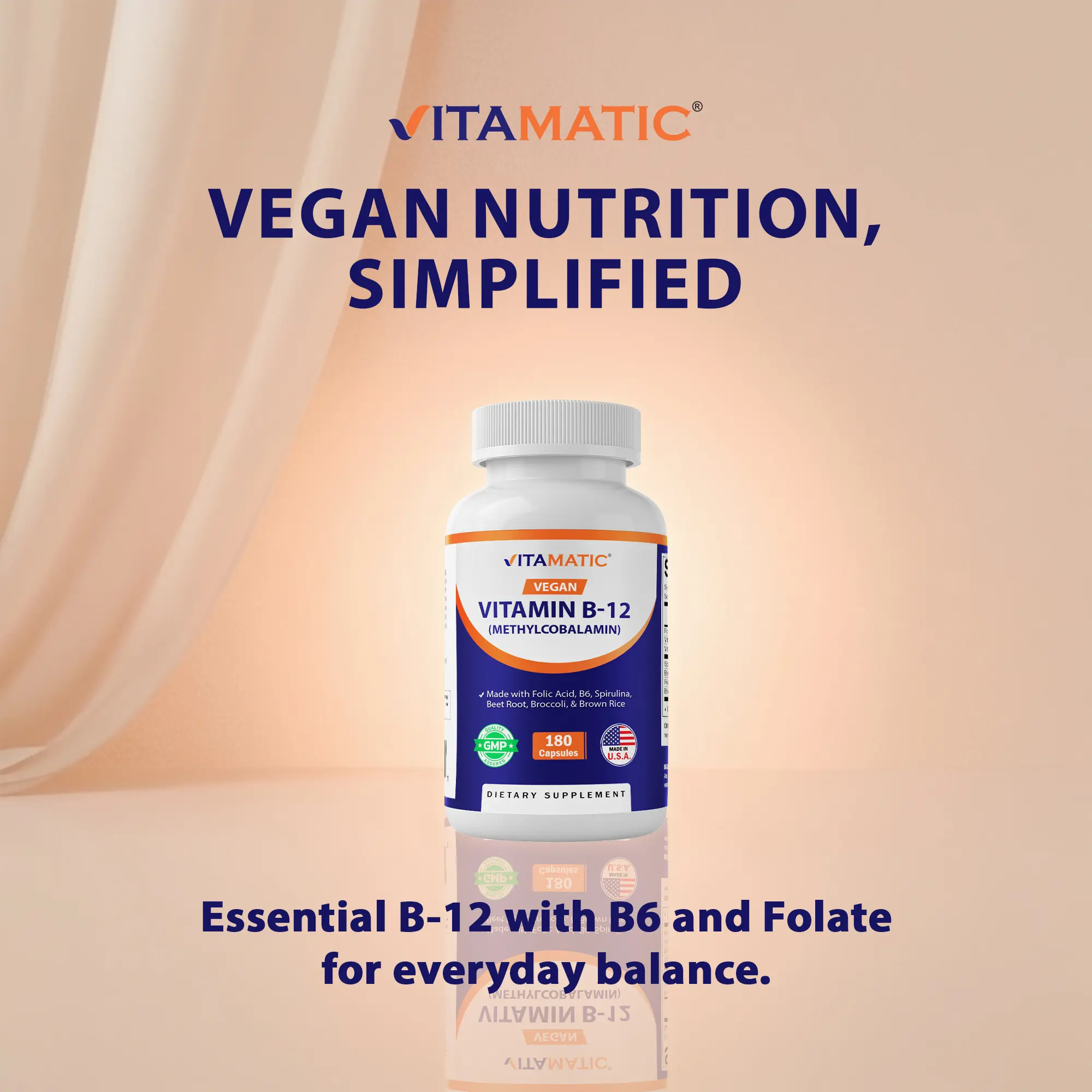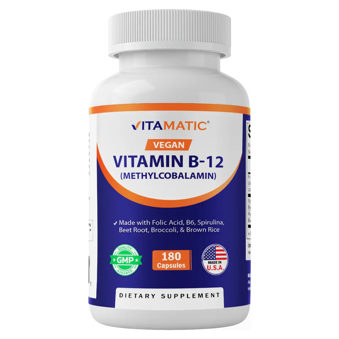 Vitamatic Vegan B12 1000 mcg is a comprehensive supplement supporting healthy mood, energy, heart, and eye health. It contains essential nutrients for overall well-being.