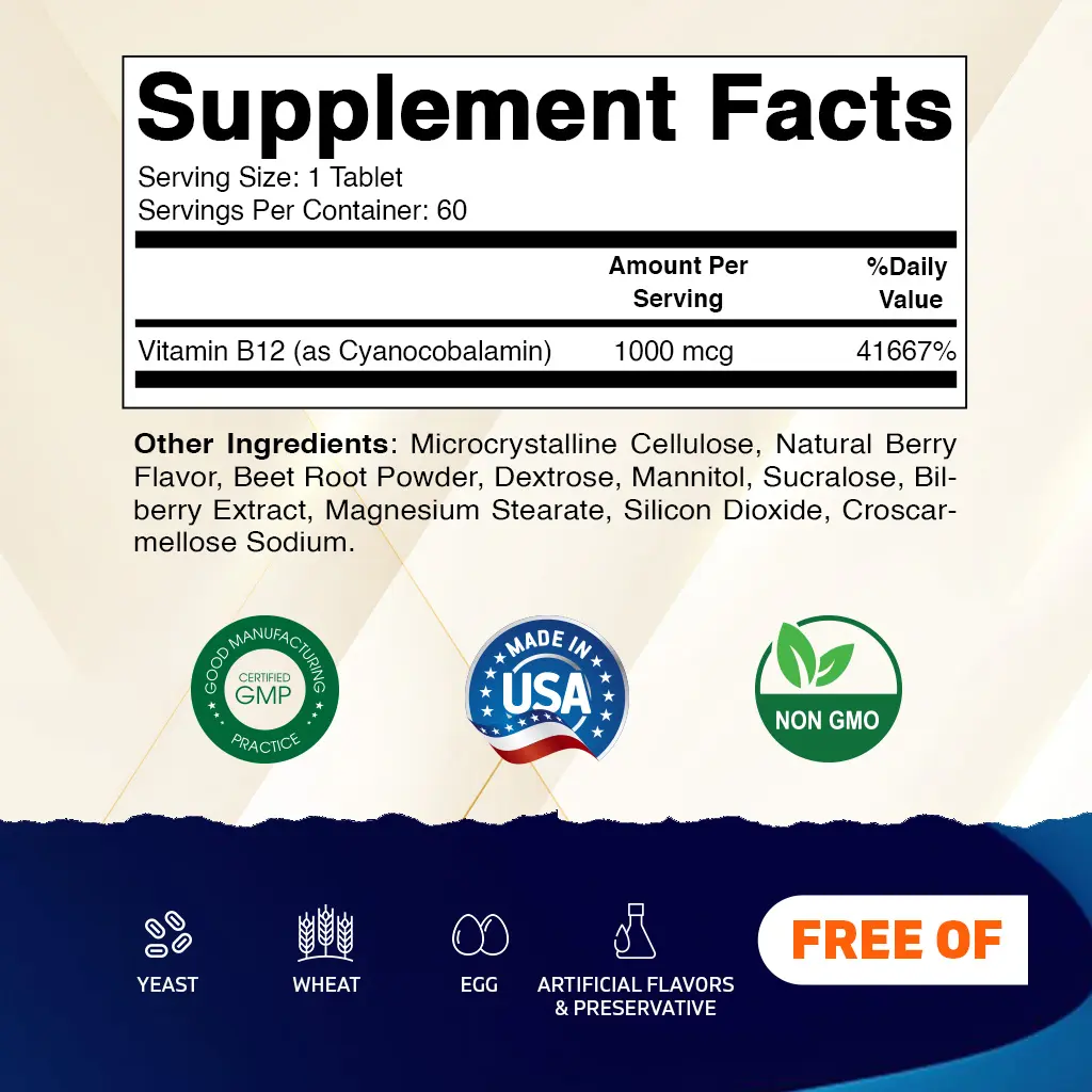 ·Each tablet delivers 1000 mcg of Vitamin B12, ensuring fast dissolution.