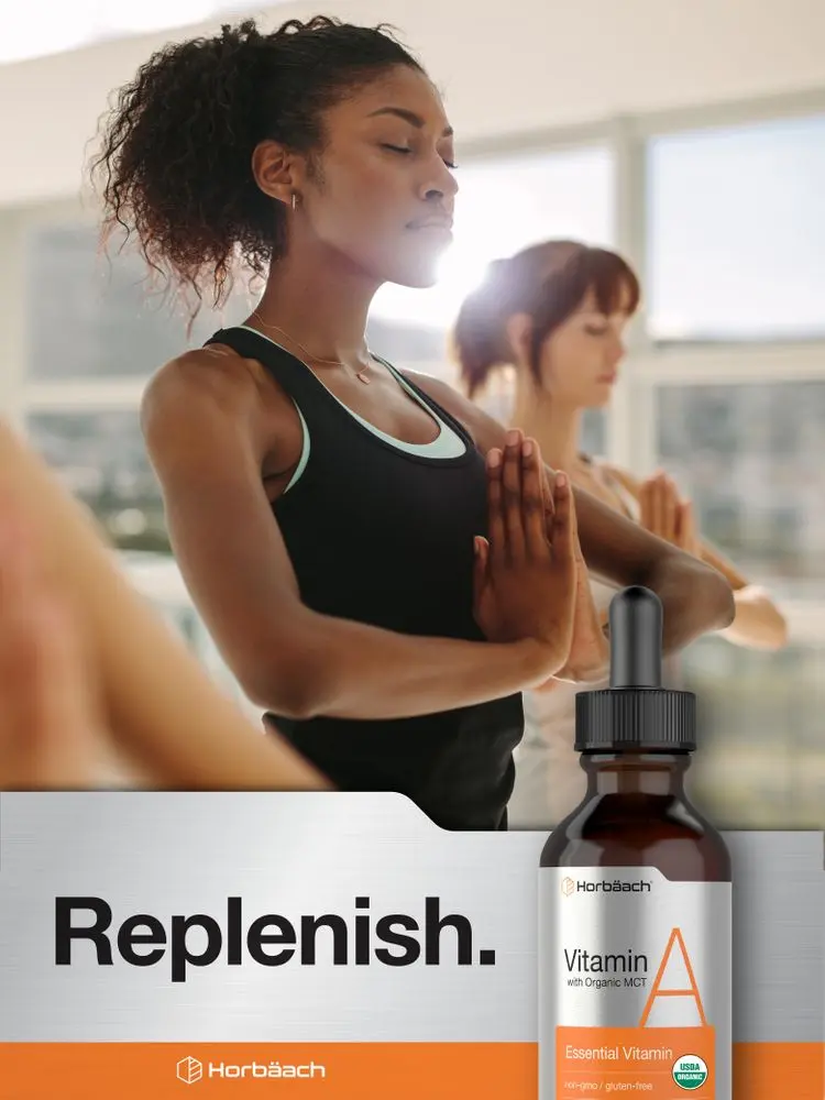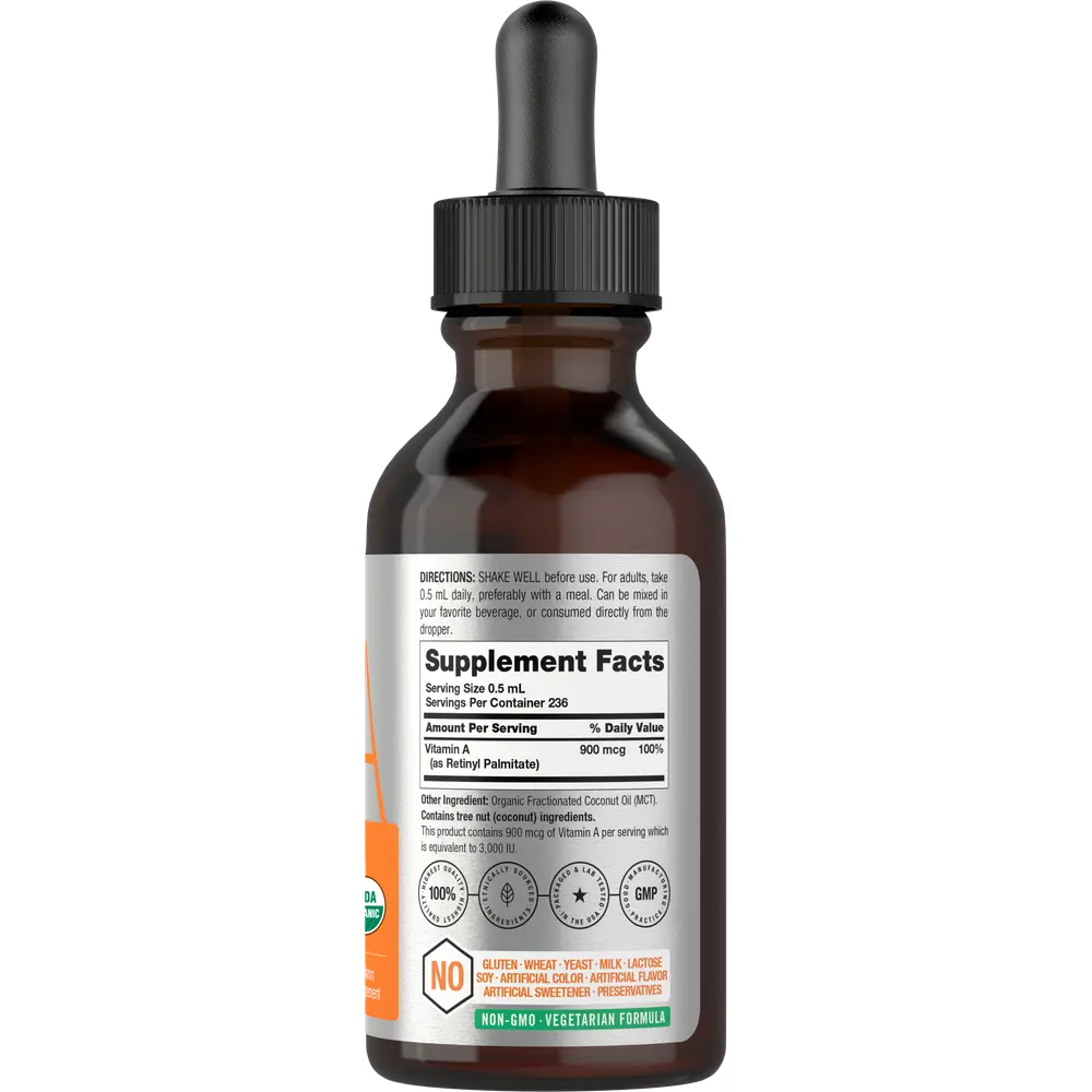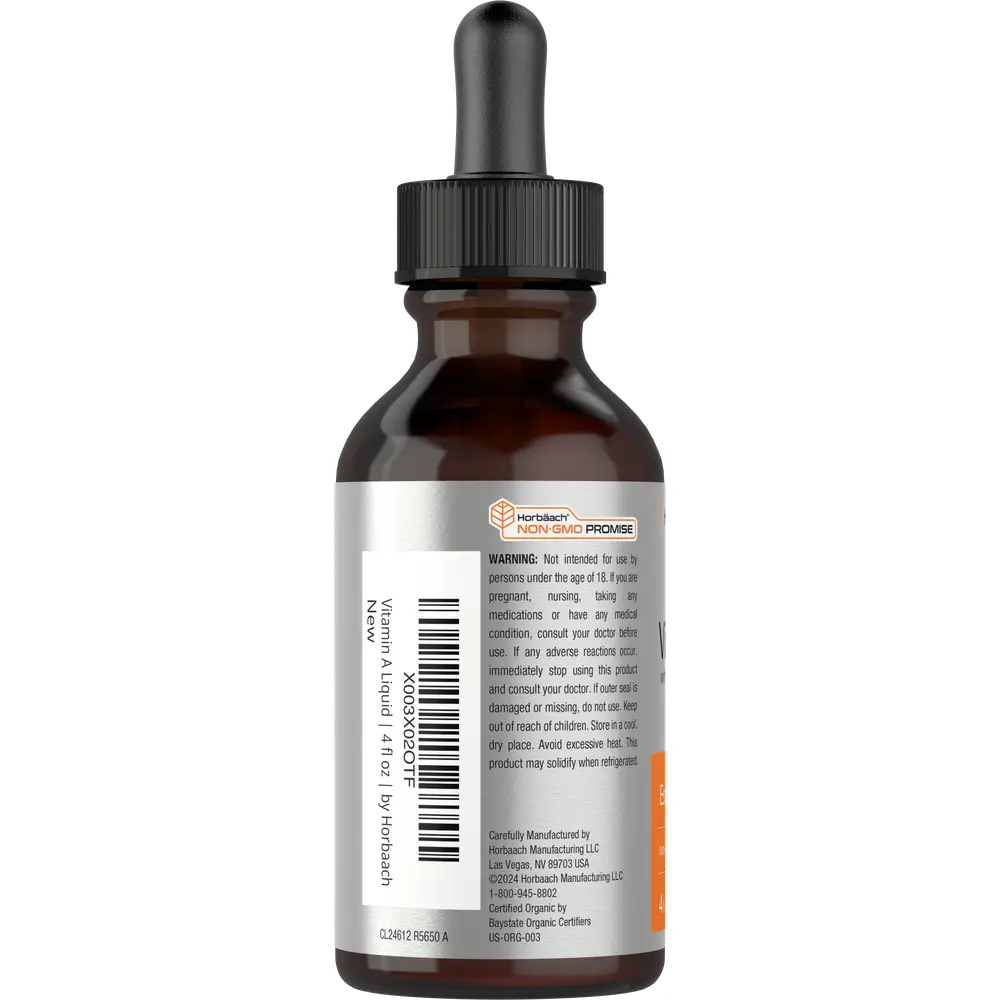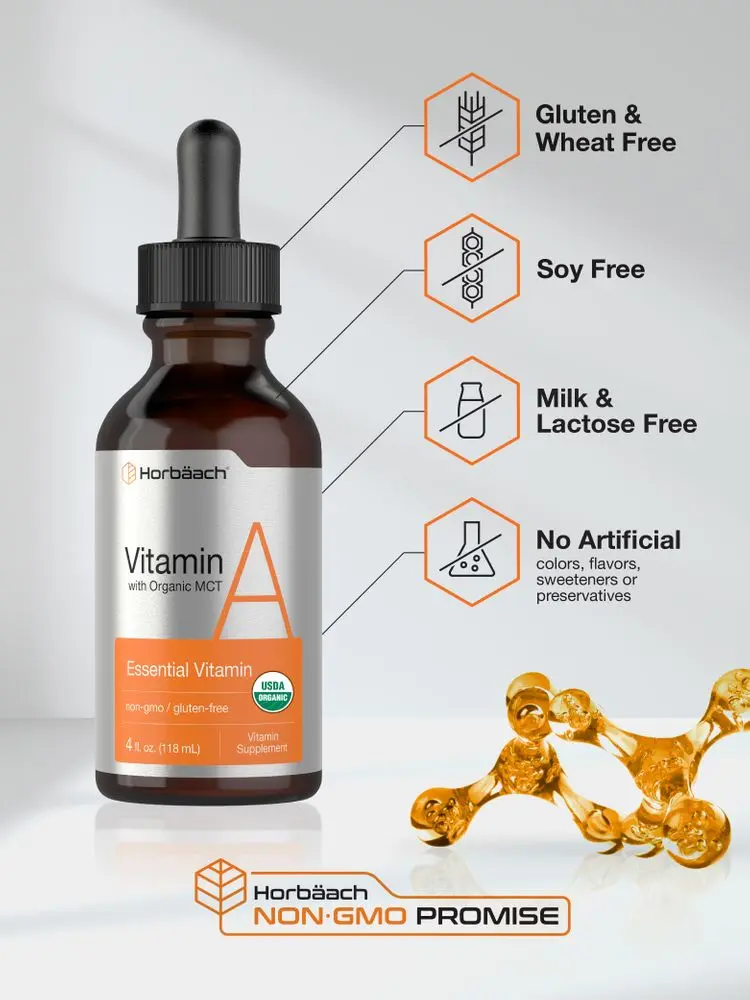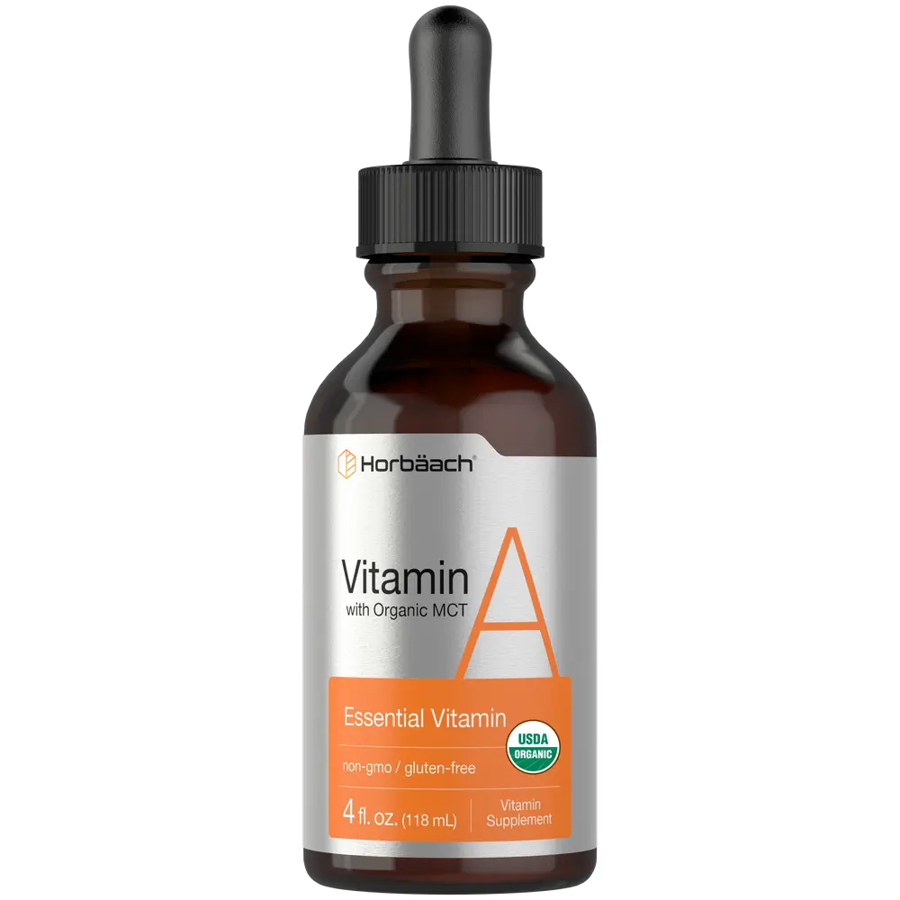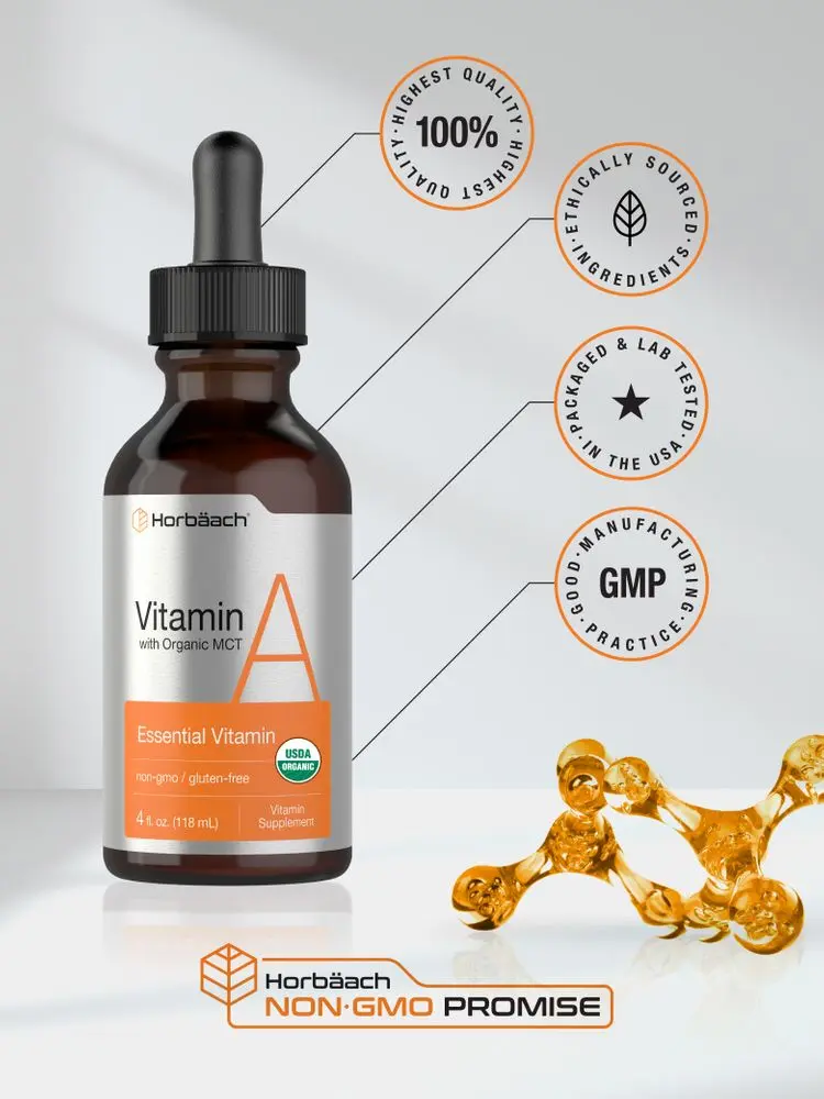 At Horbaach, our advanced supplement provides 900 mcg of Vitamin A per serving, with Organic MCT Oil. Our convenient liquid formula delivers 100% of your daily value per serving and can be mixed with your favorite beverage or consumed directly from the dropper. It's Certified Organic, gluten free and non-GMO, making it the perfect choice of Vitamin A for adult men and women everywhere!