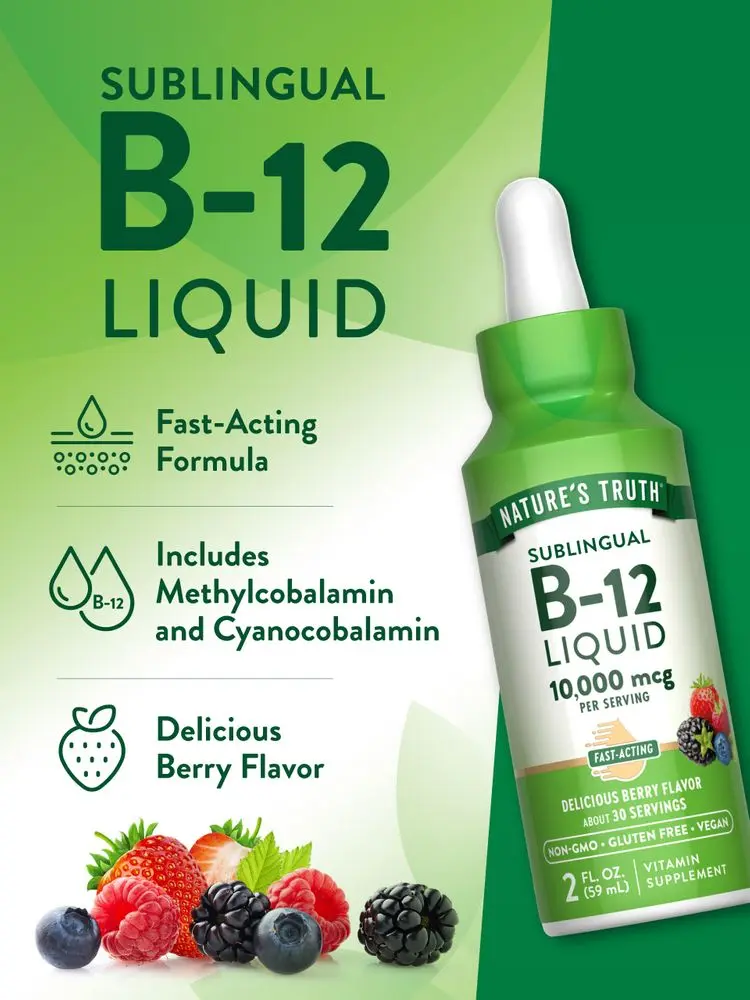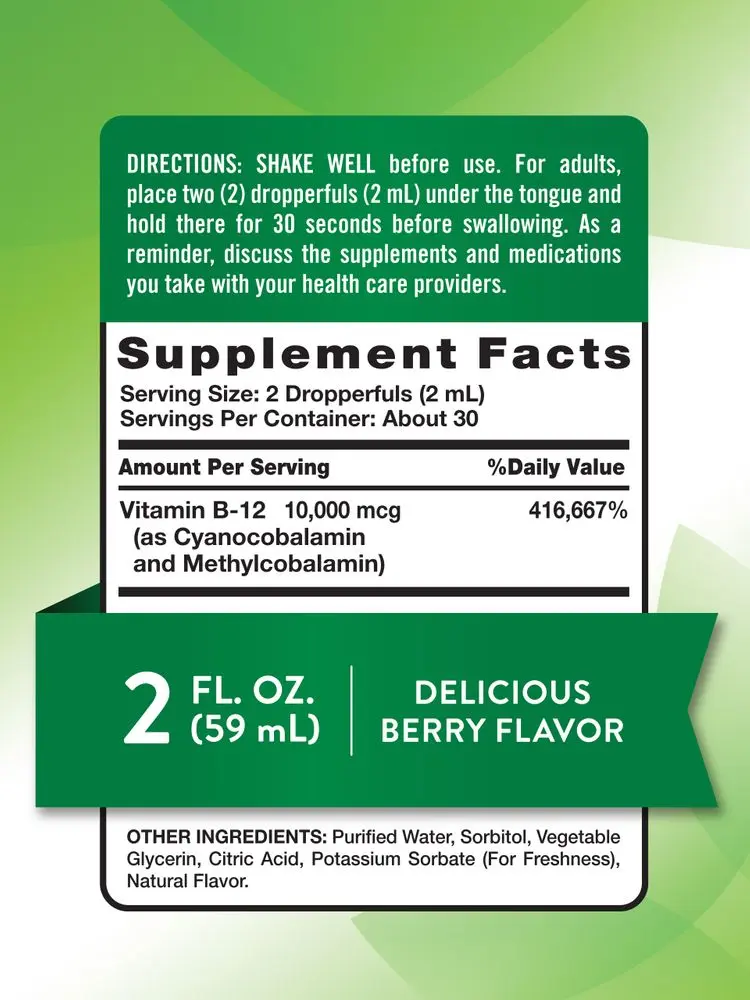 Fulfill your daily B-12 needs with our delightful berry-flavored sublingual drops, which provide vitamin B-12 as Cyanocobalamin and Methylcobalamin. Each serving supplies 10,000 mcg of this essential B-vitamin in a high-potency liquid formula for rapid absorption. Vegan friendly and delicious, these drops make enhancing your daily routine easy and enjoyable.