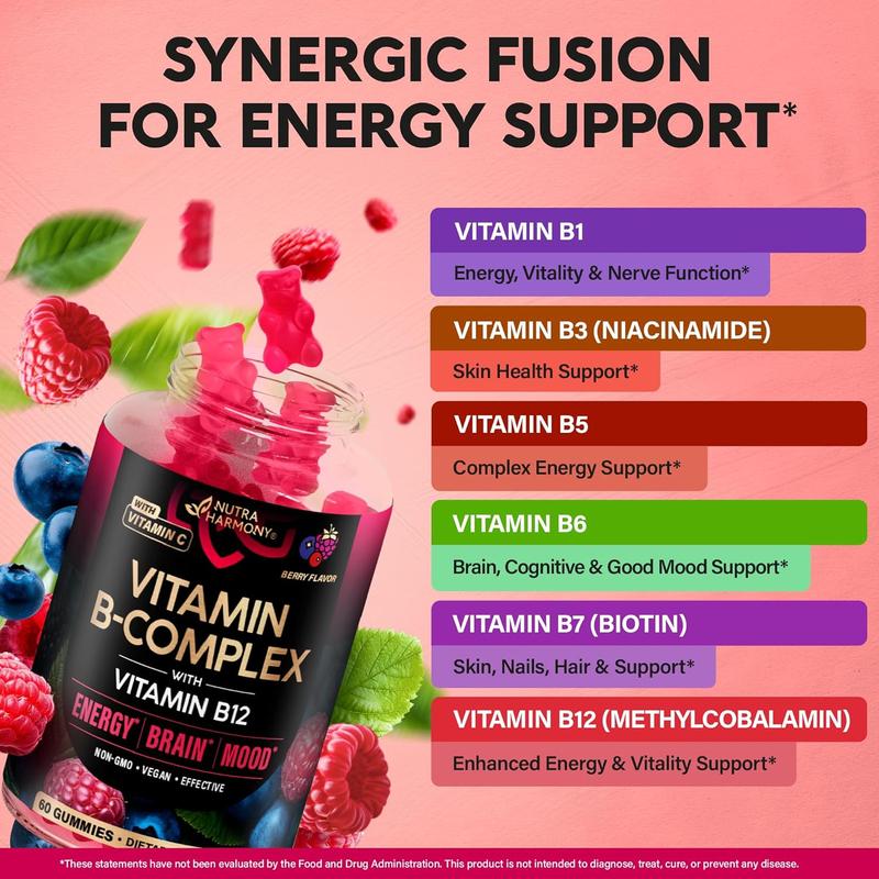 🍓Vitamins B1, B2, B3, B5, B6, B7, B12 & C — each gummy delivers powerful support with Vitamin B1 Thiamine, B2 Riboflavin, B3 Niacin, B5 Pantothenic Acid, B6 Pyridoxine, B7 Biotin, B12 Methylcobalamin, with Vitamin C, Inositol & Choline.