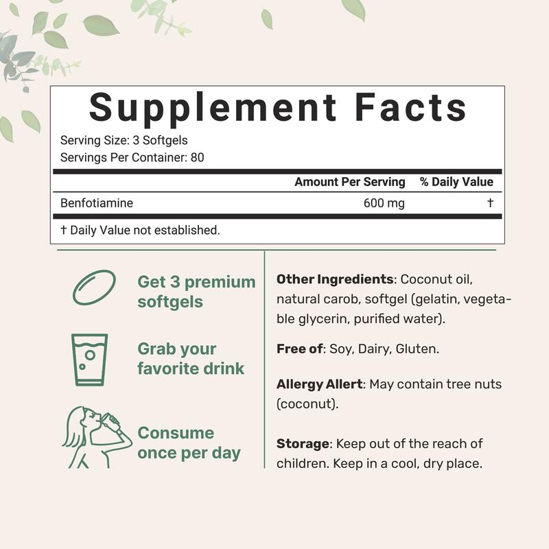 ·Each pouch contains 240 softgels, 3 softgel serving size with a 600mg pure benfotiamine dose, up to a 3-month supply.