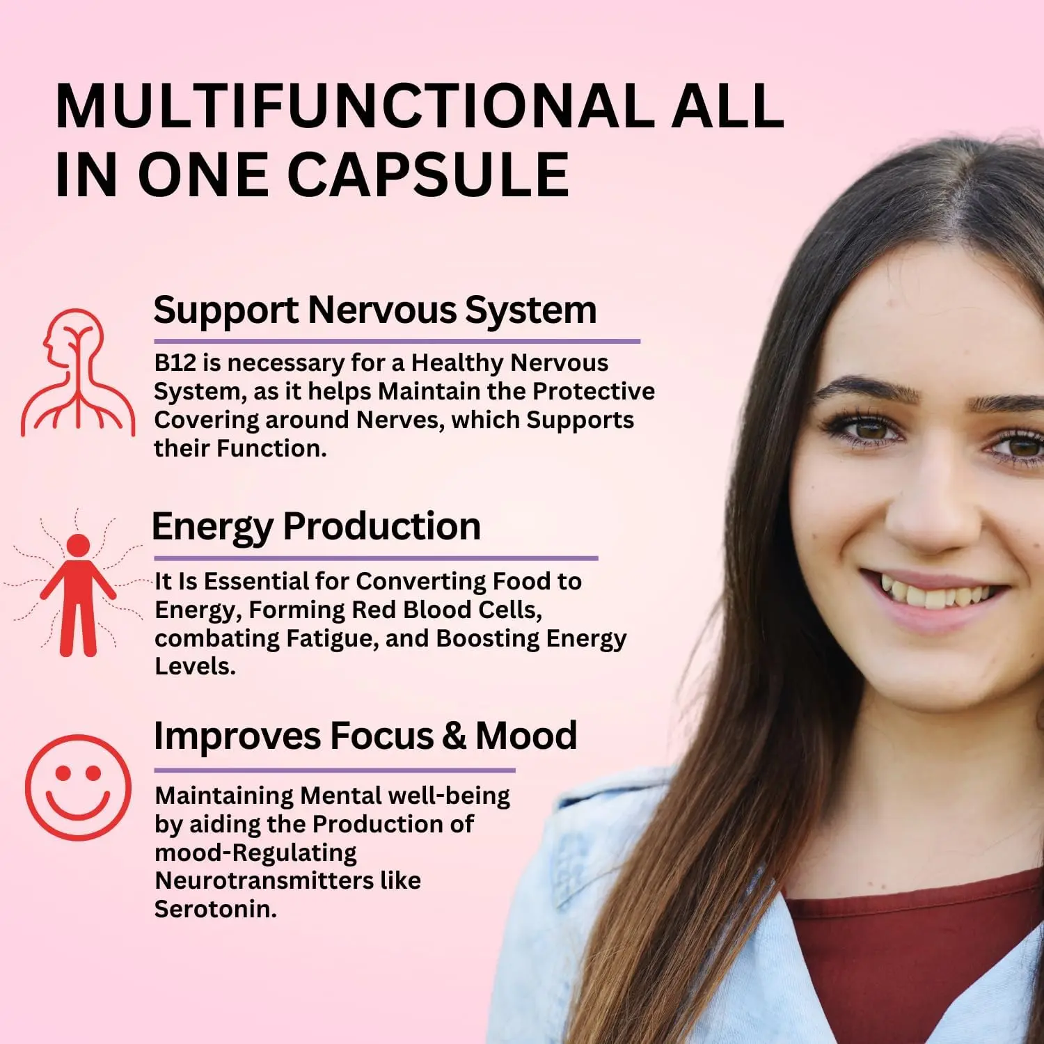 ️OTHER USES: B12 supplements helps speed up metabolism & are great immunity booster for better HEALTH & HAPPINESS. It boosts Energy Levels, Improves Mood. Good for Healthy Hair, Skin & Nails.