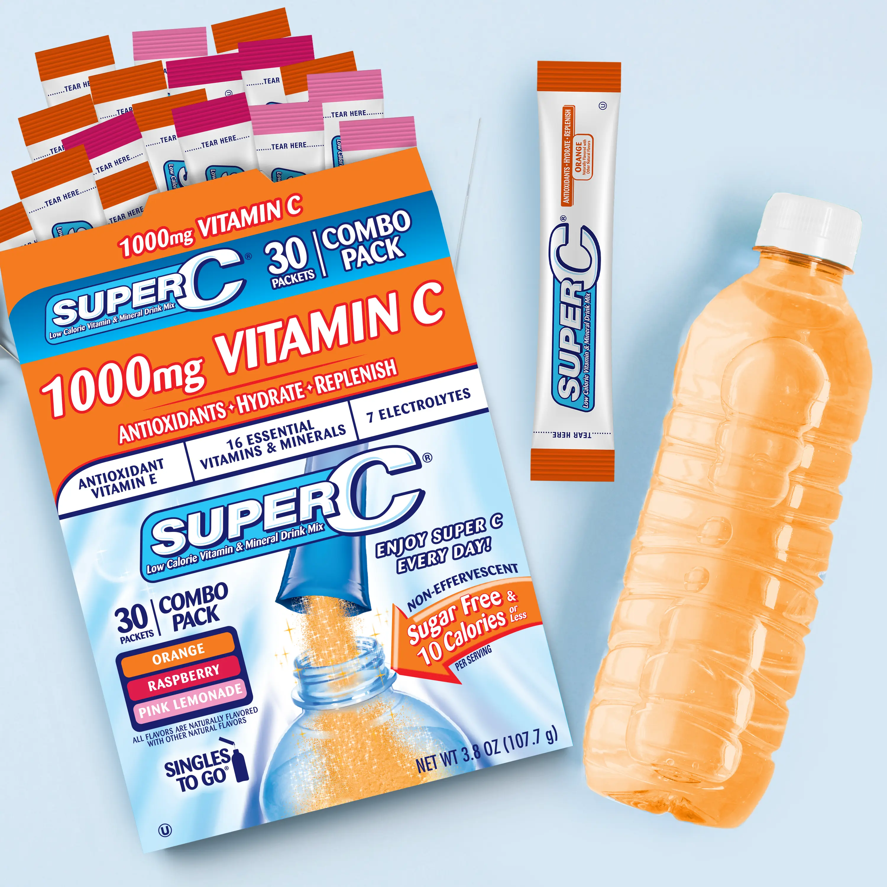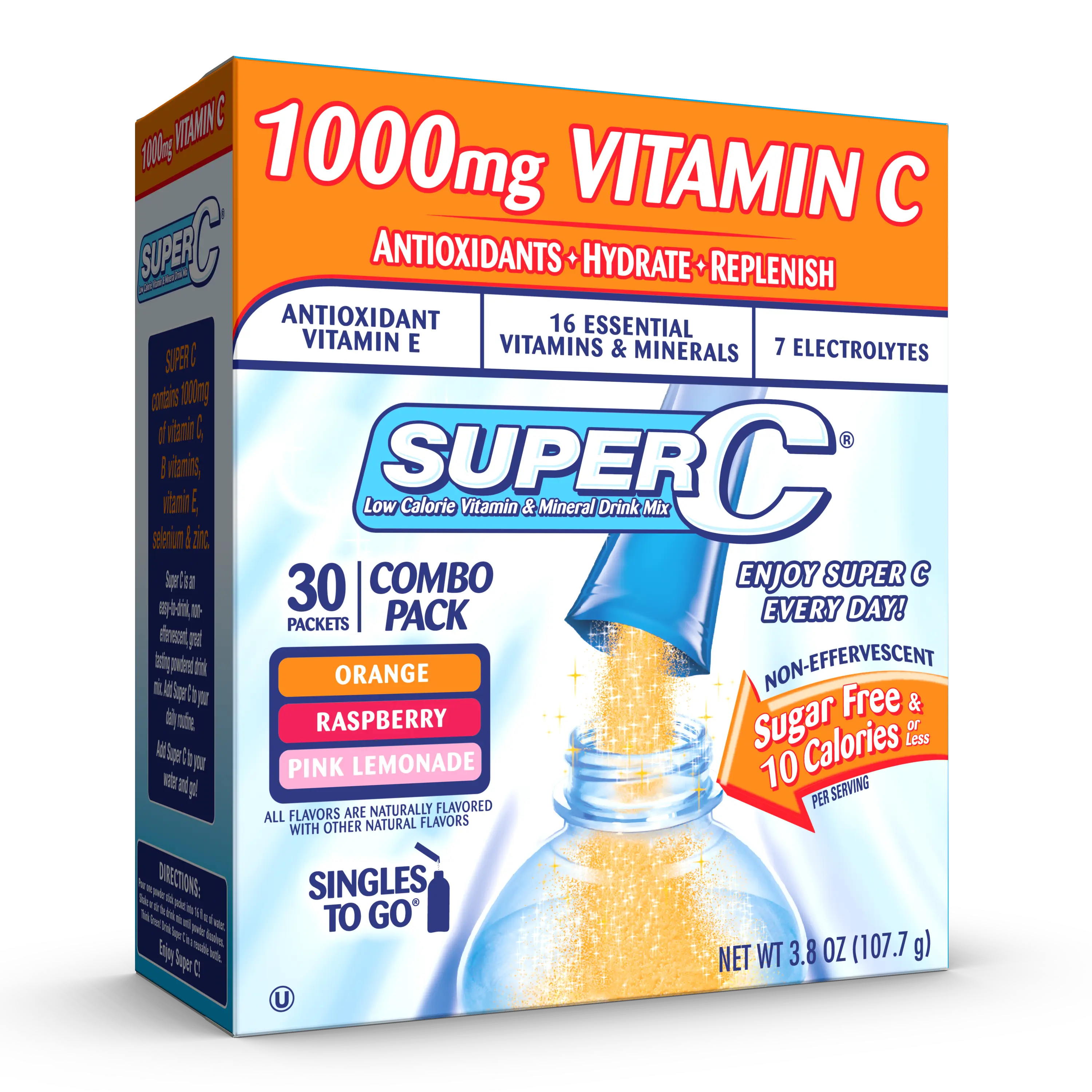 Packaged in perfectly portioned, ready-to-use sticks, Super C is easy to carry. Just toss a packet into your bag and go. The variety pack includes 3 flavors: Orange, Raspberry, and Pink Lemonade. Each stick is naturally flavored with other natural tastes. Not recommended for children or pregnant women.