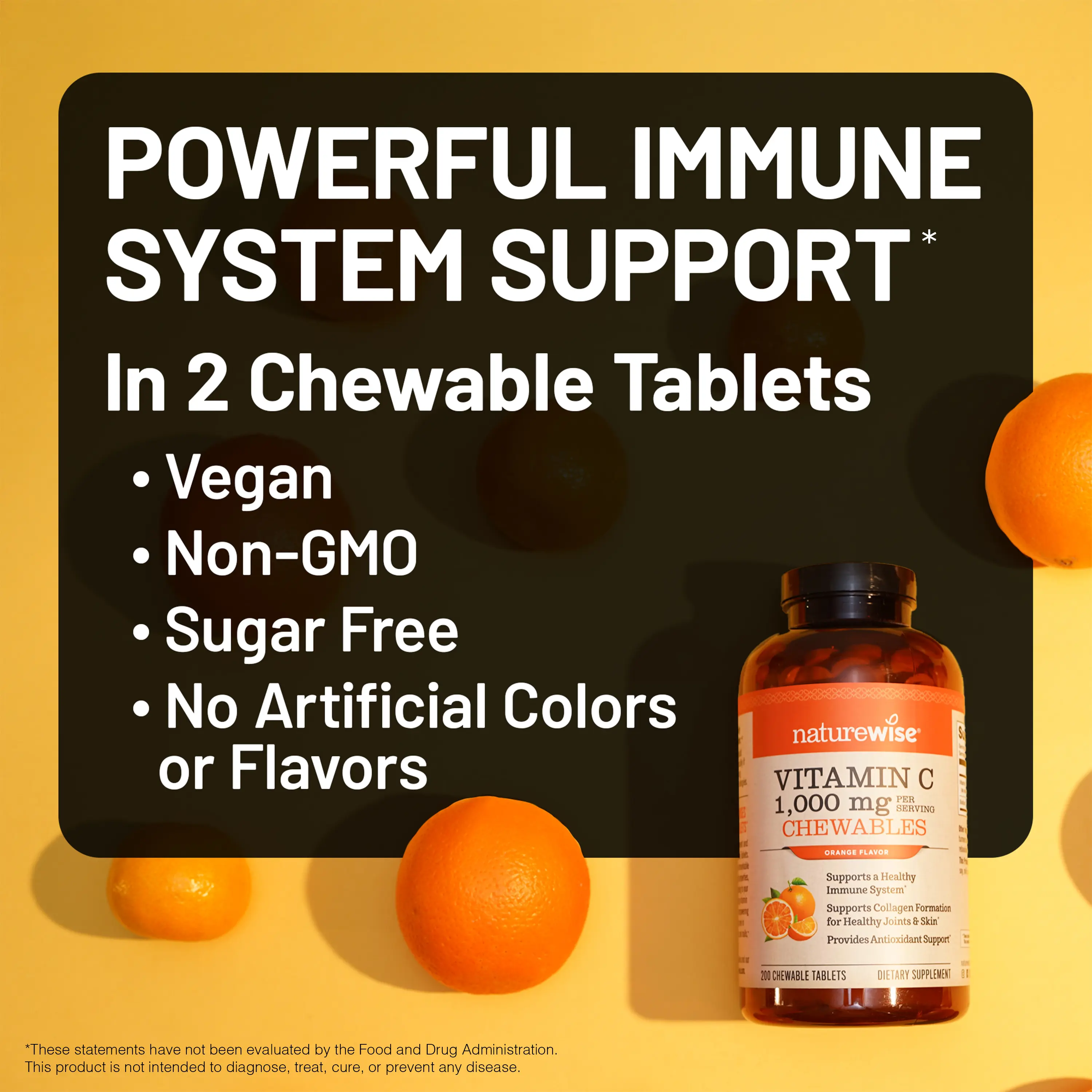 ·Natural Orange Flavor: NatureWise Vitamin C Chewable Tablets use natural orange flavor and have no artificial colors or flavors. Take 2 NatureWise Vitamin C 1,000 mg Chewables daily and treat your tastebuds with a tangy, orange-flavored treat.*