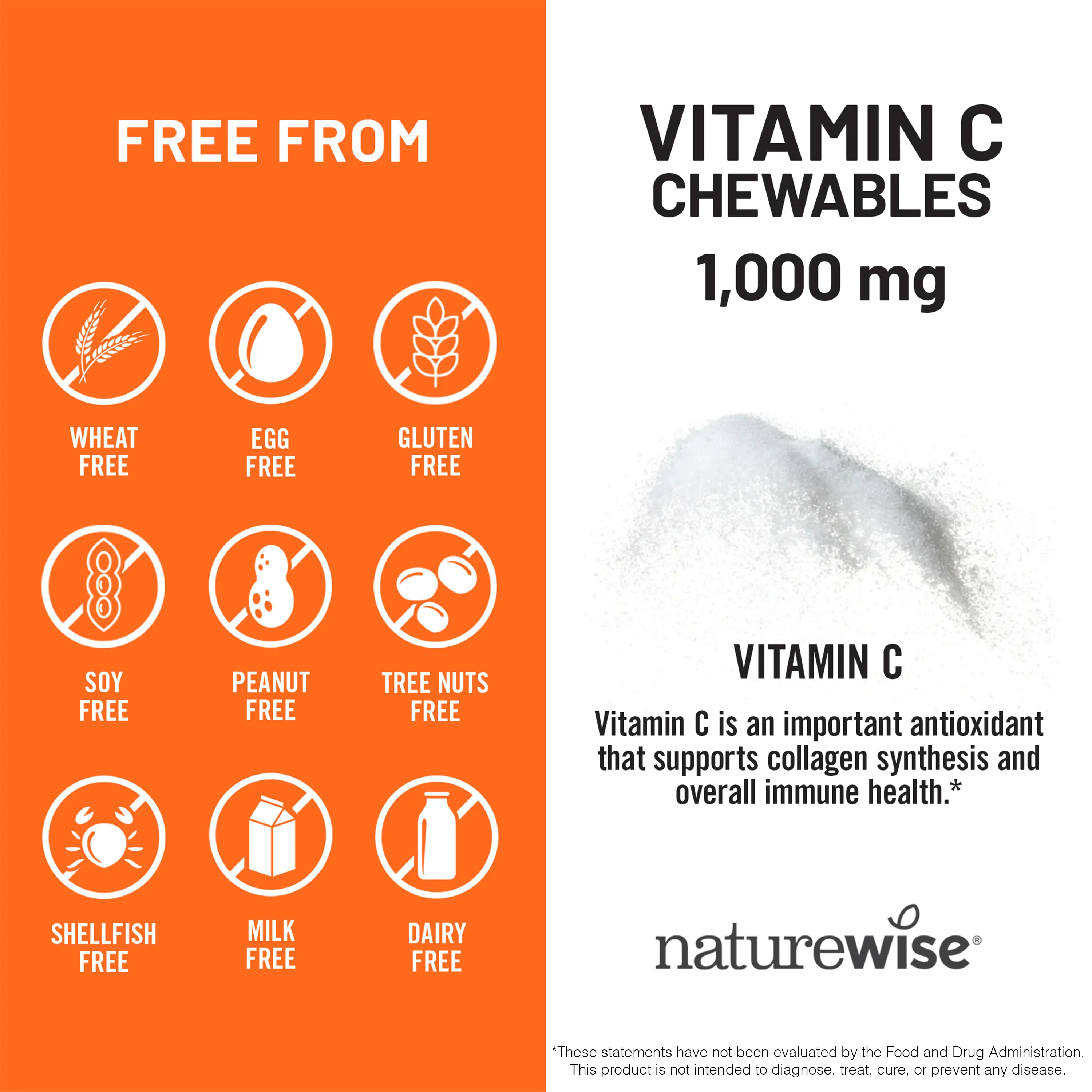 ·Vegan, Non-GMO & Sugar Free: NatureWise Vitamin C Chewables 1000mg are vegan, non-GMO, sugar free and gluten free. These premium chewable tablets do not contain wheat, gluten, dairy, eggs, soy, milk, tree nuts, peanuts, shellfish, artificial colors or flavors.