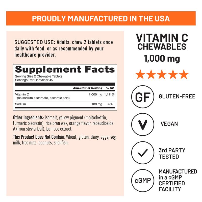 Vitamin C is an important nutrient that supports your daily health in many ways: Vitamin C supports your overall immunity and collagen synthesis.* Two of these chewable vitamin C tablets contain a potent dose of 1,000 mg of vitamin C or 1,111% of your daily intake.