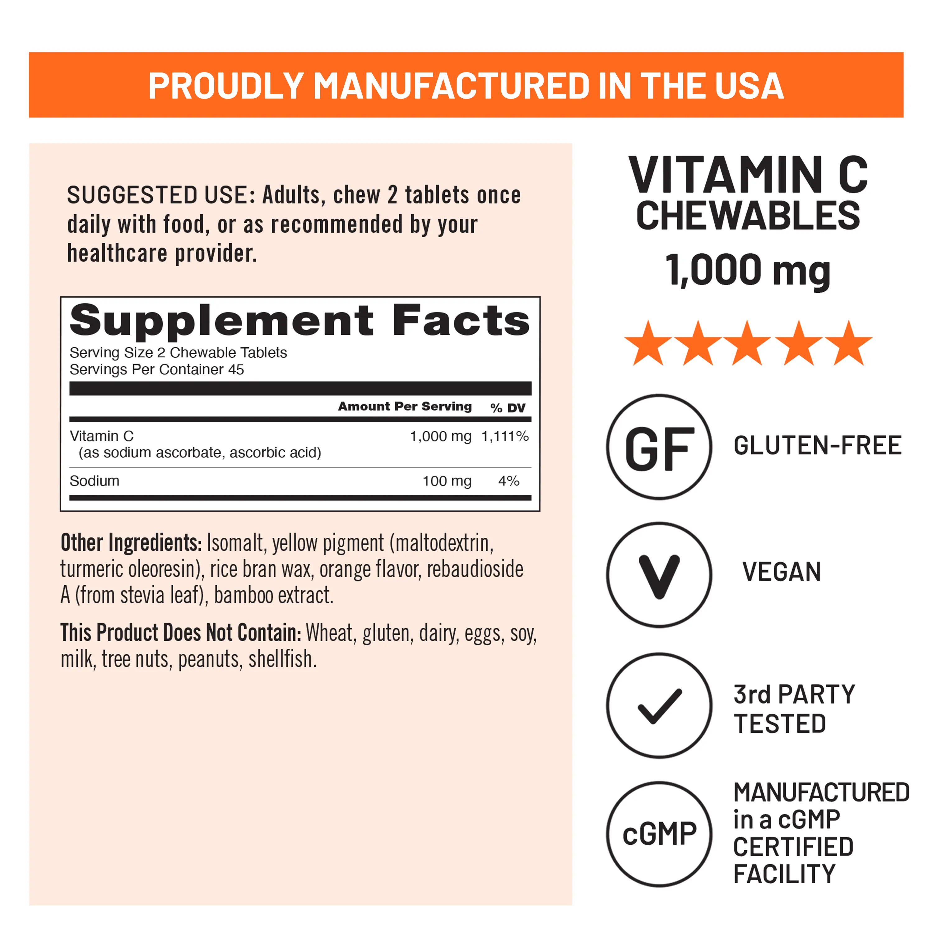 NatureWise Vitamin C Chewables - 1,000 mg are vegan, gluten-free, and third-party tested for purity and potency. This chewable vitamin C does not contain wheat, gluten, dairy, eggs, soy, milk, tree nuts, peanuts, and shellfish.
