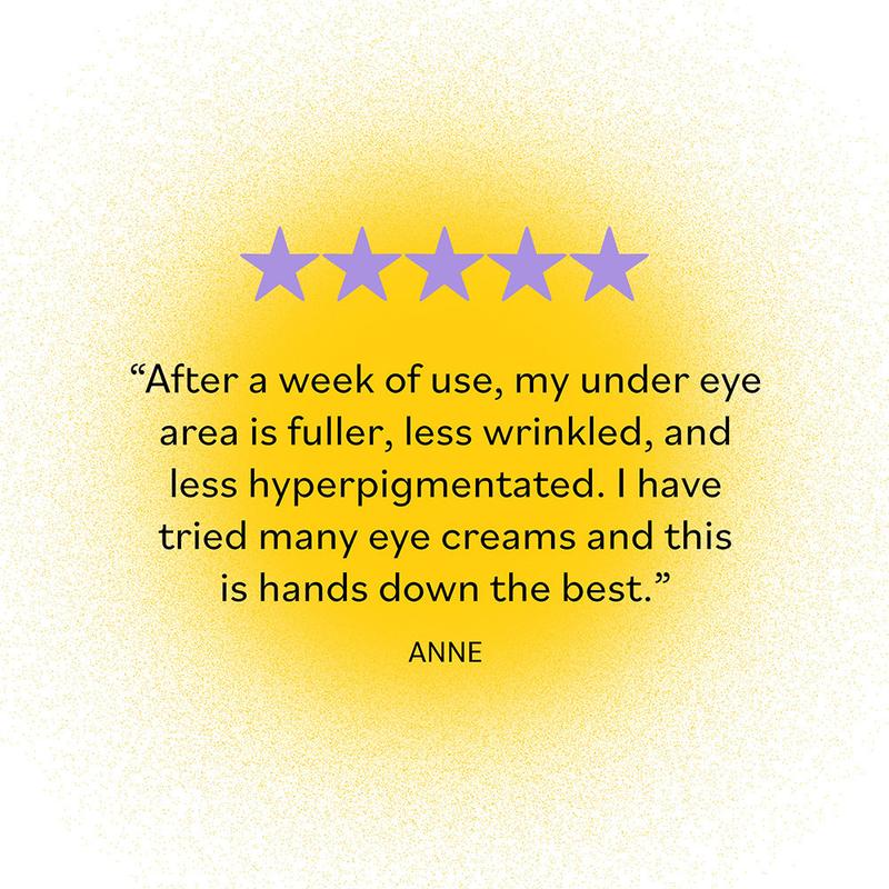 This Vitamin C eye cream is infused with antioxidant-rich Vitamin C, brightening Turmeric, Mica, and de-puffing Caffeine to instantly color-correct for brighter eyes.