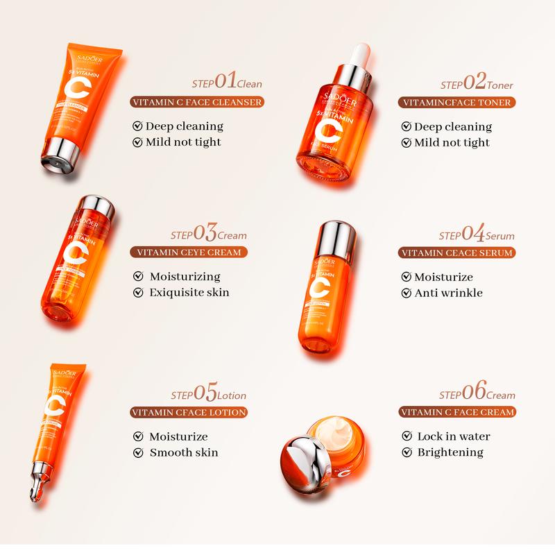 When you receive this full set of skin care with a Vitamin C regimn you know you are getting all you need for your and more, this acts as your powerful antioxidant that not only brightens, but firms, gives you 1 waseven tones, and protects against the sun/pollution damage and when you can boost collagen and fight free radicals, reducing wrinkles, dark spots, and inflammation you have a genie in a set right here...