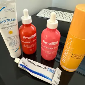 Active living in the desert, my derm says, Vit C and Sunscreen and Retinol at night. I also need a good Vit C does not interfere or cloud contact lenses when using around the eyes. I want a simple routine that does it all and not think about it again. After lots of research, Timeless has it above all others. Reviews say it ranks with top dog brand SkinC. Then, you have the AMAZING customer support here! Since discovering Timeless, I'm a loyalist and advocate. Buy it, you'll use it and be happy. Don't think about it again. You're taking care of your skin! I really love this brand and their service (big shout out to to Lindsay!!). Photo of my super simple routine.