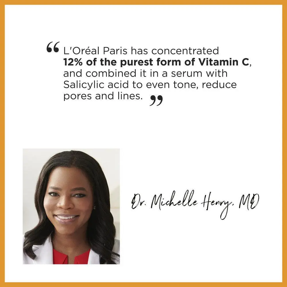 L'Oreal Paris Vitamin C serum combines 12 percent of the purest and most potent form of Vitamin C with Vitamin E, Salicylic acid to instantly brighten skin and visibly reduce key signs of early aging over time, 12 percent Pure Vitamin C helps brighten tone and neutralize free radicals. Formula with Pure Vitamin E and Salicylic Acid helps refine pores and even skin texture, Skin complexion is instantly brighter and more radiant. Skin feels moisturized and looks smoother, After 8 weeks skin looks 70 percent brighter, pores 59 percent less visible, feels 83 percent smoother. Key signs of early aging look reduced, Allergy Tested, Paraben, Dye, Mineral Oil Free. Dermatologist Tested Suitable for Sensitive Skin. Made for all skin types, tones.