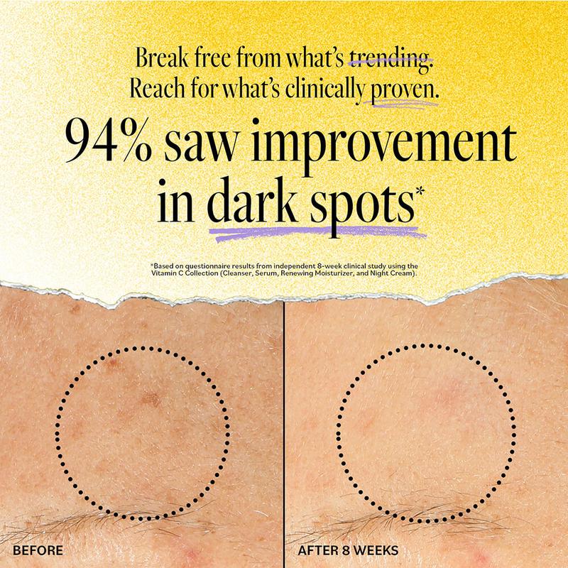Our concentrated Vitamin C face serum is dermatologist-recommended and clinically proven to beautifully brighten the appearance of dull or uneven skin tone and support collagen production. Formulated with Stay C-50®, a stabilized form of Vitamin C that stays potent and has a longer shelf life than non-stabilized forms, this serum reduces the appearance of dark spots and hyperpigmentation while boosting moisture with our hero hydrator, Hyaluronic Acid.