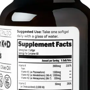 Our Vitamin D + K supplement provides 2000iu of vitamin D3 per softgel. Unlike other brands that use seed oils as carriers, our supplement uses olive oil as the carrier. Olive oil is rich in healthy fats and antioxidants, and it enhances the absorption of vitamin D. Plus, it has a mild flavor and does not cause any unpleasant aftertaste. Our vitamin D plus K supplement is made with natural ingredients and contains no artificial colors, flavors, preservatives, or artificial fillers.