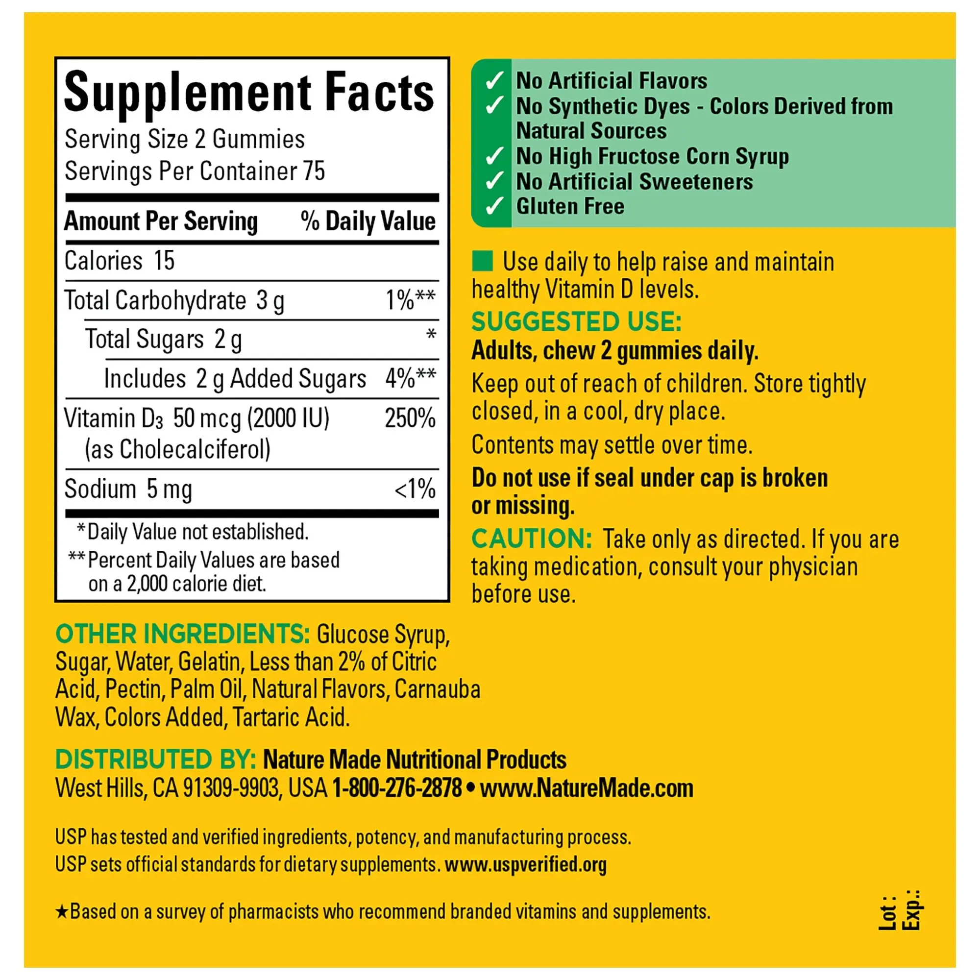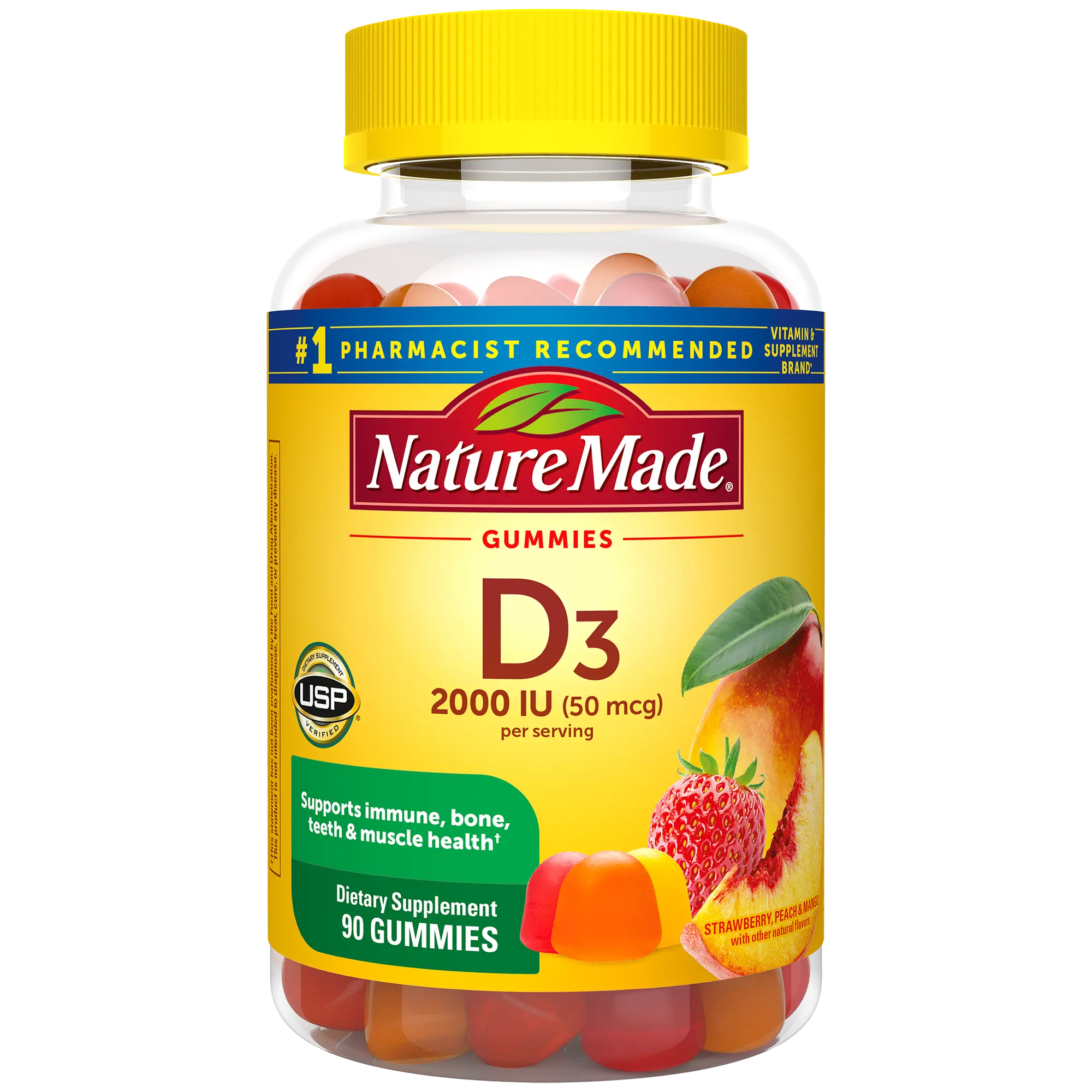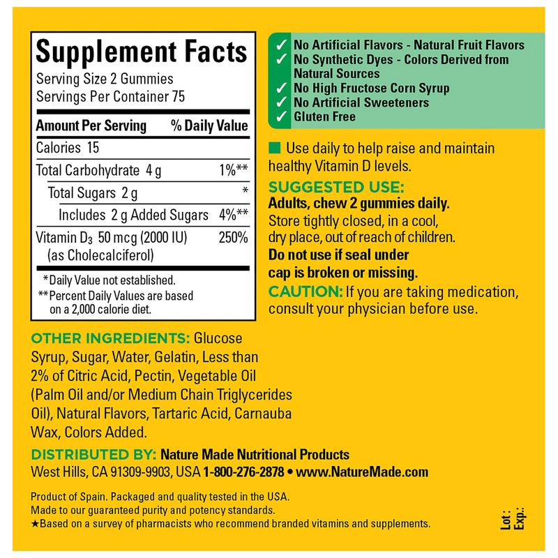 Get a daily dose of Vitamin D in two delicious gummies. Nature Made® D3 Gummies provides 2000 IU (50 mcg) per serving to support bone, teeth, muscle and immune health.†