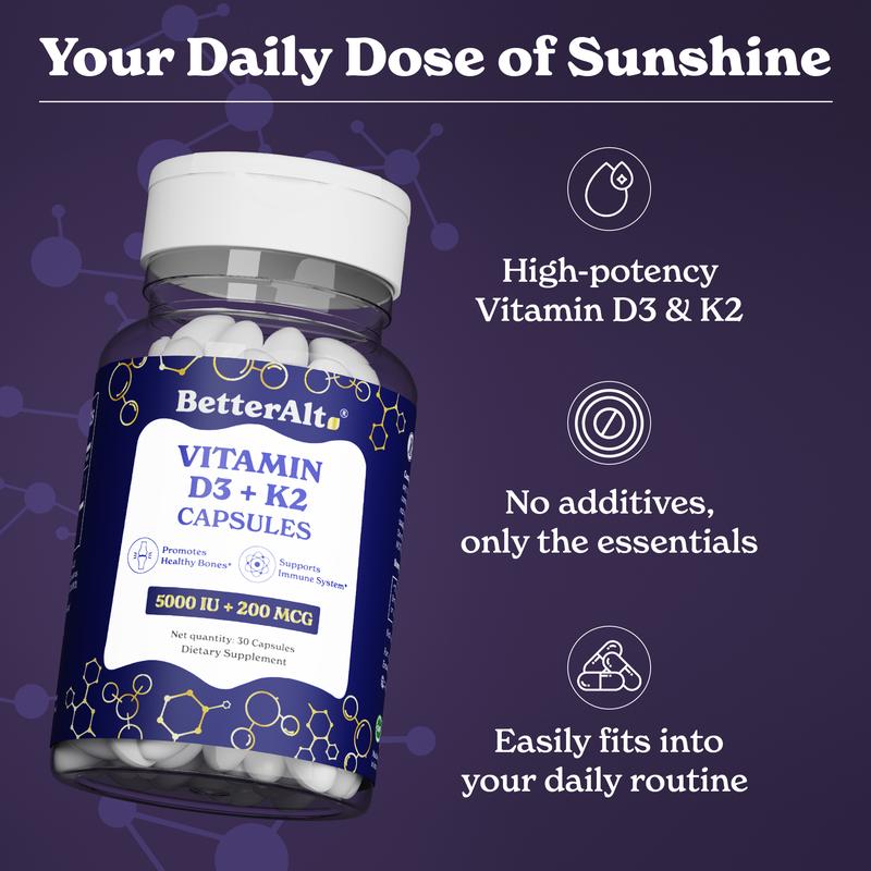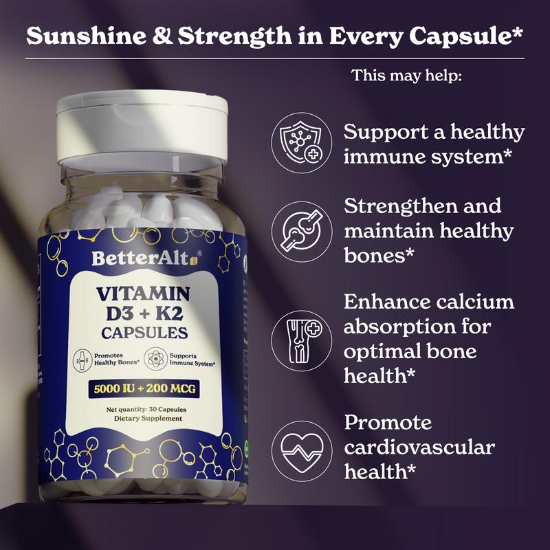 ·BetterAlt’s Vitamin D3+K2 capsules are a thoughtfully crafted supplement designed to support your overall wellness.*