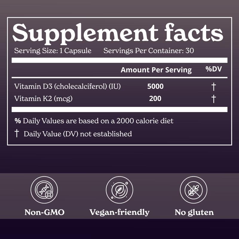 ·Each capsule delivers a potent blend of 5000 IU of Vitamin D3 and 200 mcg of Vitamin K2 to help promote bone strength, calcium absorption, and immune health.*