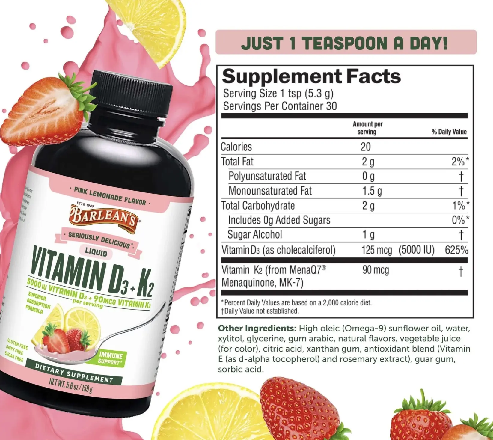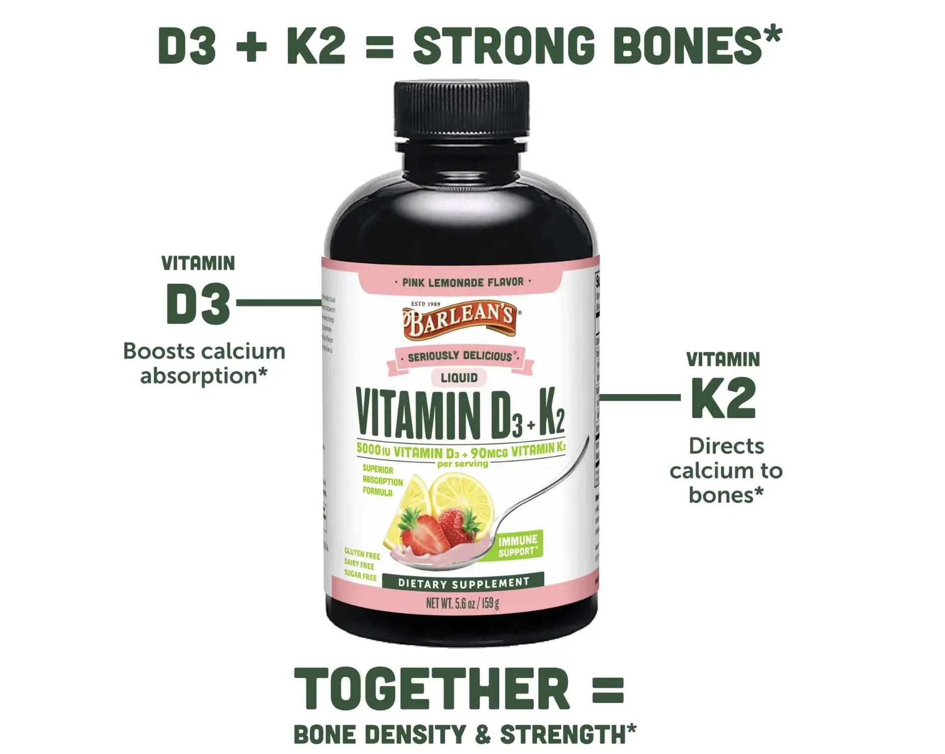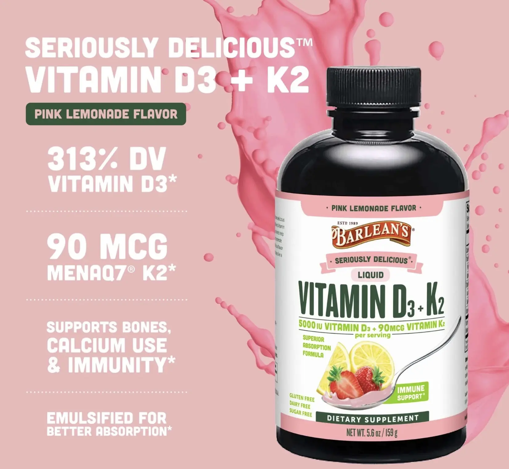 Get the perfect vitamin pair in every delicious spoonful with Barlean's Seriously Delicious Pink Lemonade Vitamin D3+K2 — advanced emulsified formula that combines two essential nutrients working synergistically to support bone health, cardiovascular function, and immune wellness. With 5,000 IU of Vitamin D3 and 90 mcg of Vitamin K2 (MK-7) per serving, this dynamic duo helps optimize calcium utilization in a smooth, creamy texture that tastes like dessert! *