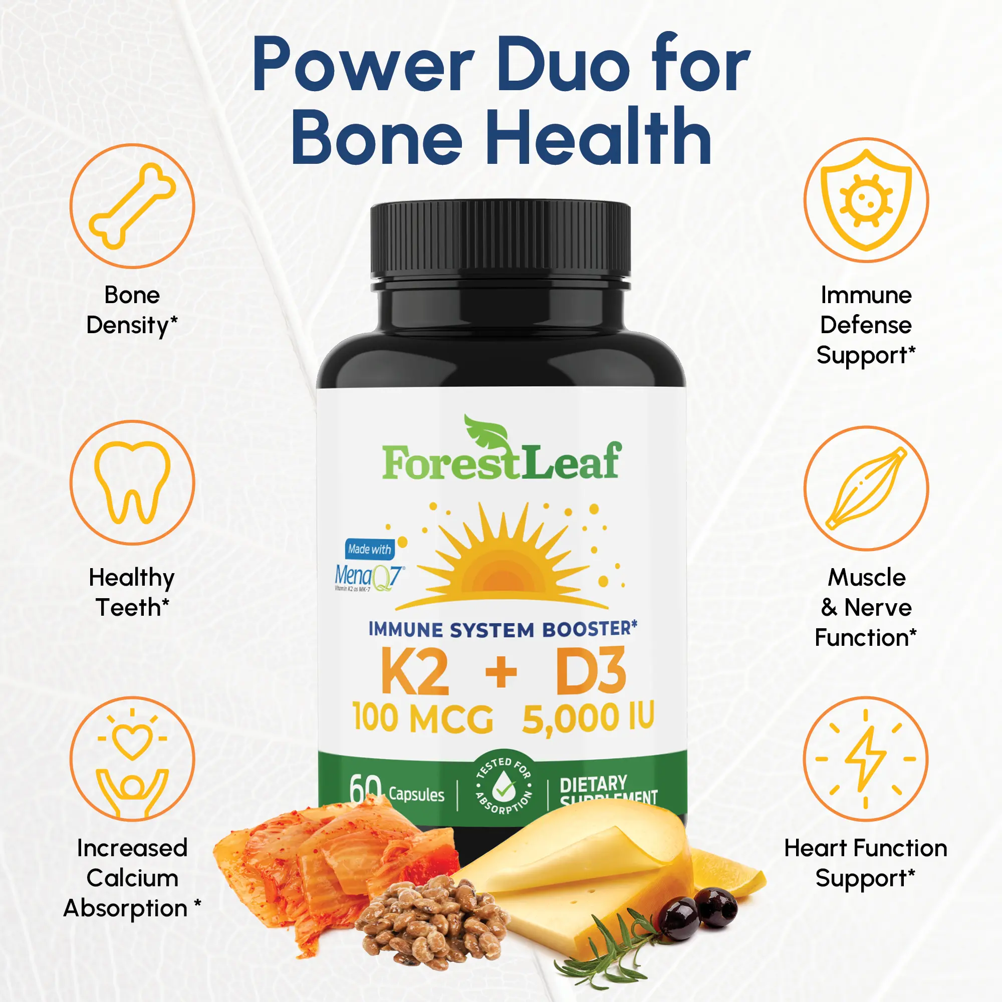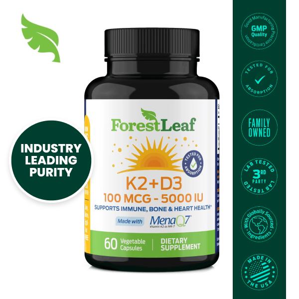 D3 + K2 BETTER TOGETHER - Vitamin D3 ensures that calcium is absorbed easily while Vitamin K2 is responsible for activating a protein that integrates calcium into bone. The potent combination of D3 + K2 (as MK7 menaquinone-7) works together to help our body harness the benefits of calcium from supplements or diet.