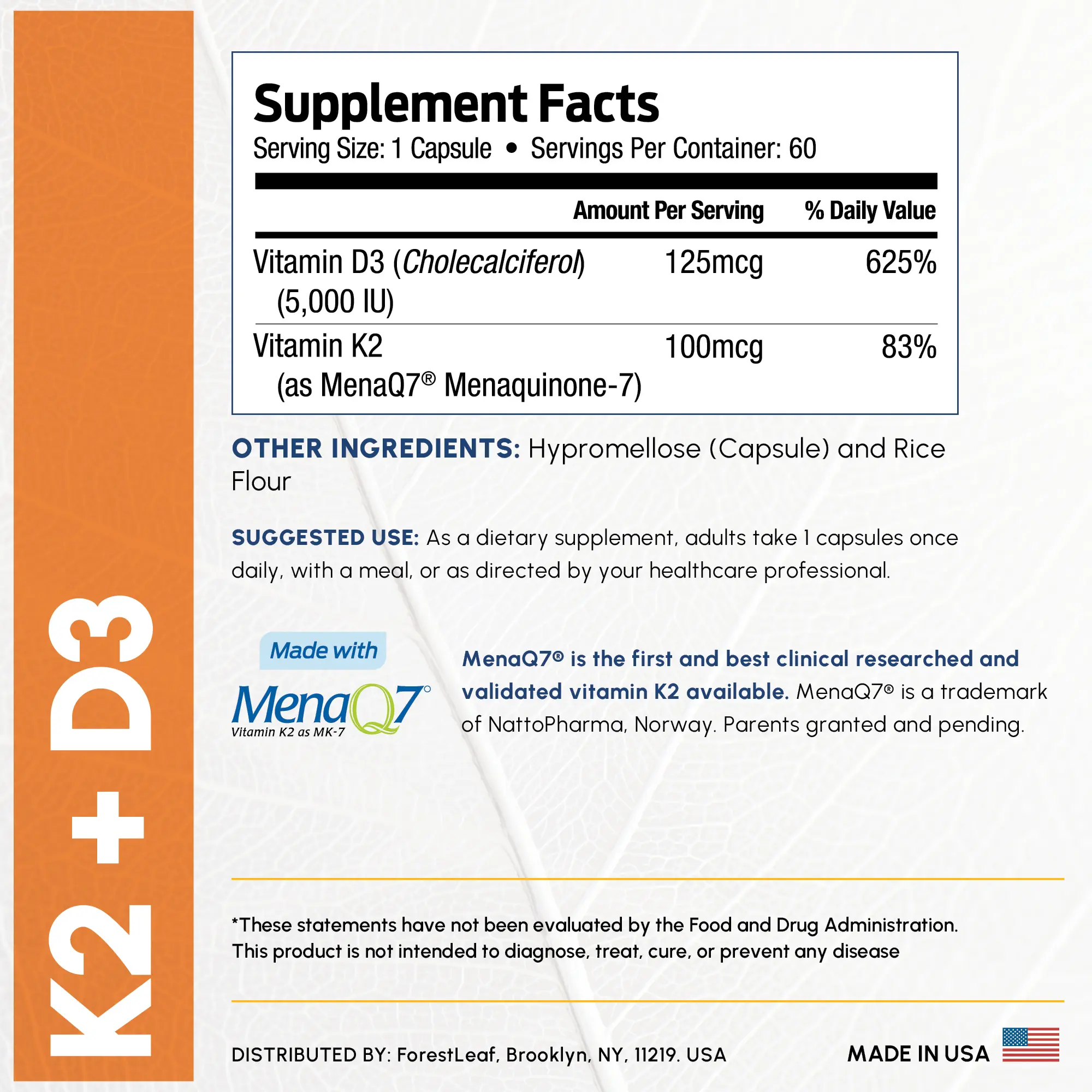 PREMIUM FORMULATION - Each serving of D3 Vitamin + K2 (MenaQ7) is made from natural vegetable sources. These pills are 100% gluten, dairy, nut, egg and sugar free. The Non-GMO formula is free of artificial additives, dyes, hormones, and flavors. Manufactured in the USA.