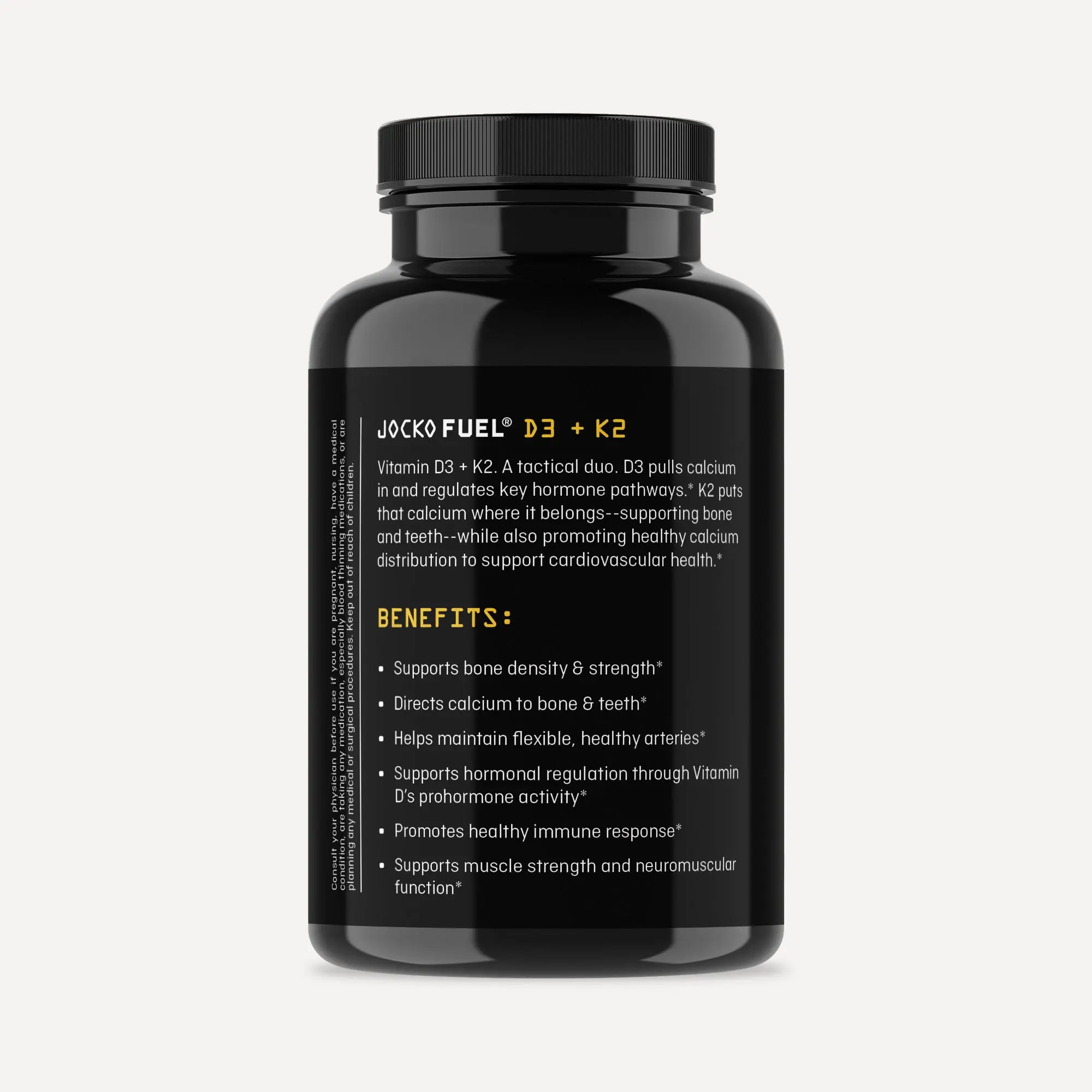 - 200 mcg of Vitamin K2 (as MK-7) — a clinically relevant dose that activates proteins responsible for directing calcium into bone and away from arteries.