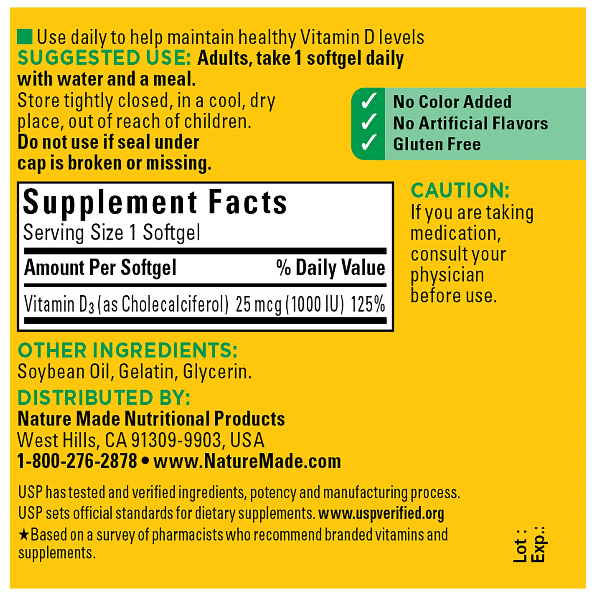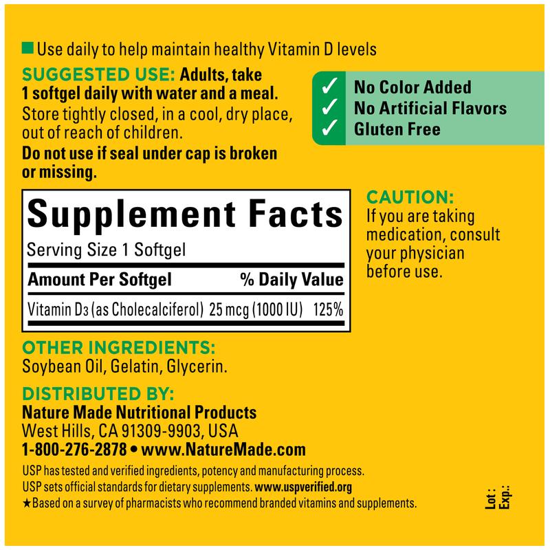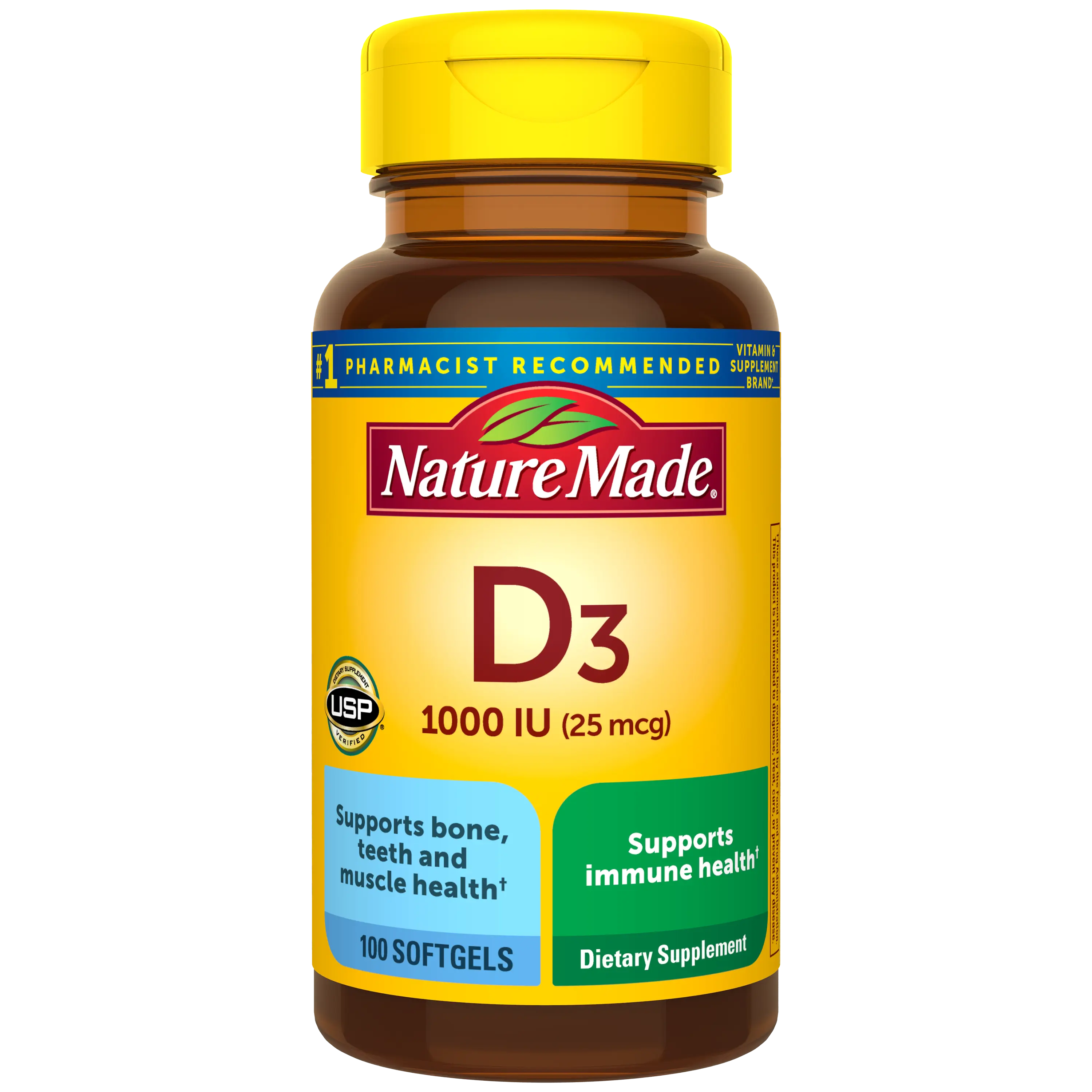 Nature Made® Vitamin D 1000 IU (50 mcg) supports bone, teeth, muscle and immune health. Take one softgel daily to help maintain healthy Vitamin D levels in the body.†