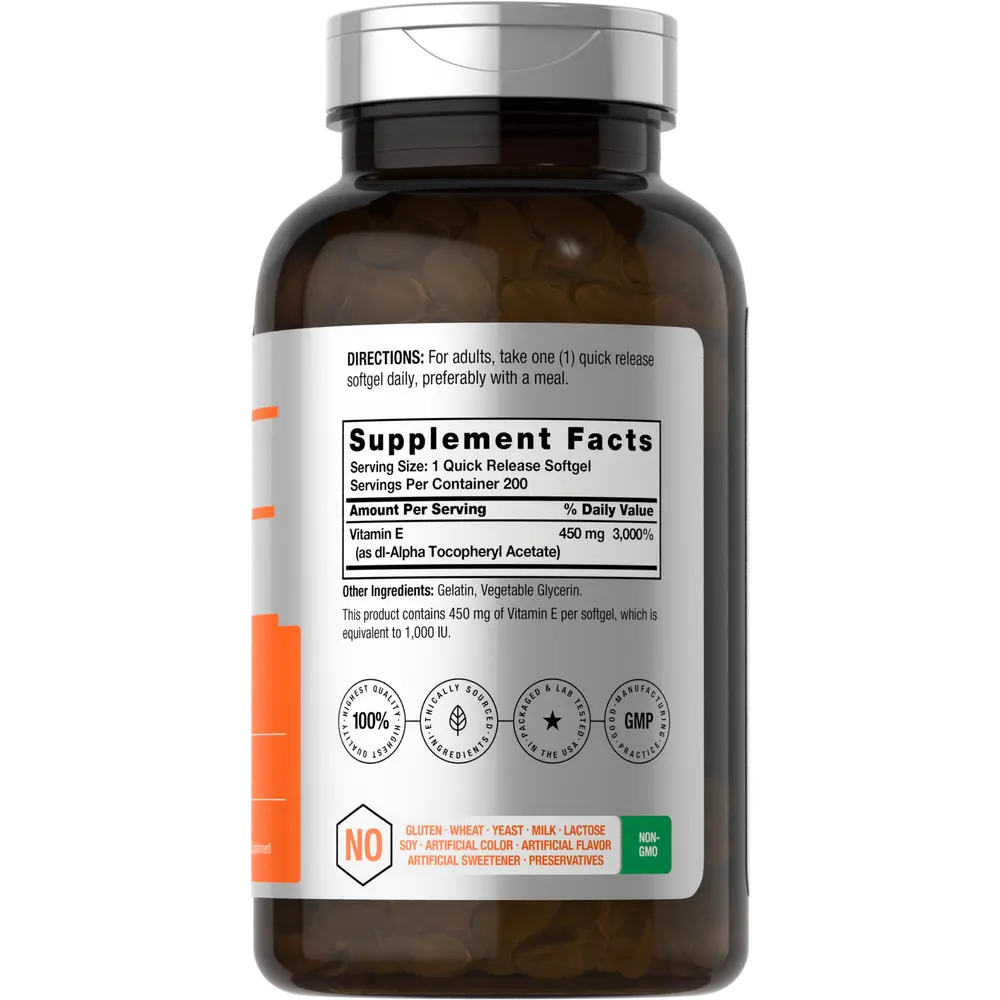At Horbaach, our Vitamin E supplement packs a powerful supply of this essential nutrient for daily support. Each quick-release softgel contains 450 mg (1000 IU) per serving of Vitamin E, which is 3000% of your daily value! Our formula is gluten-free and non-GMO with no preservatives, making it the best choice for a balanced wellness routine.
