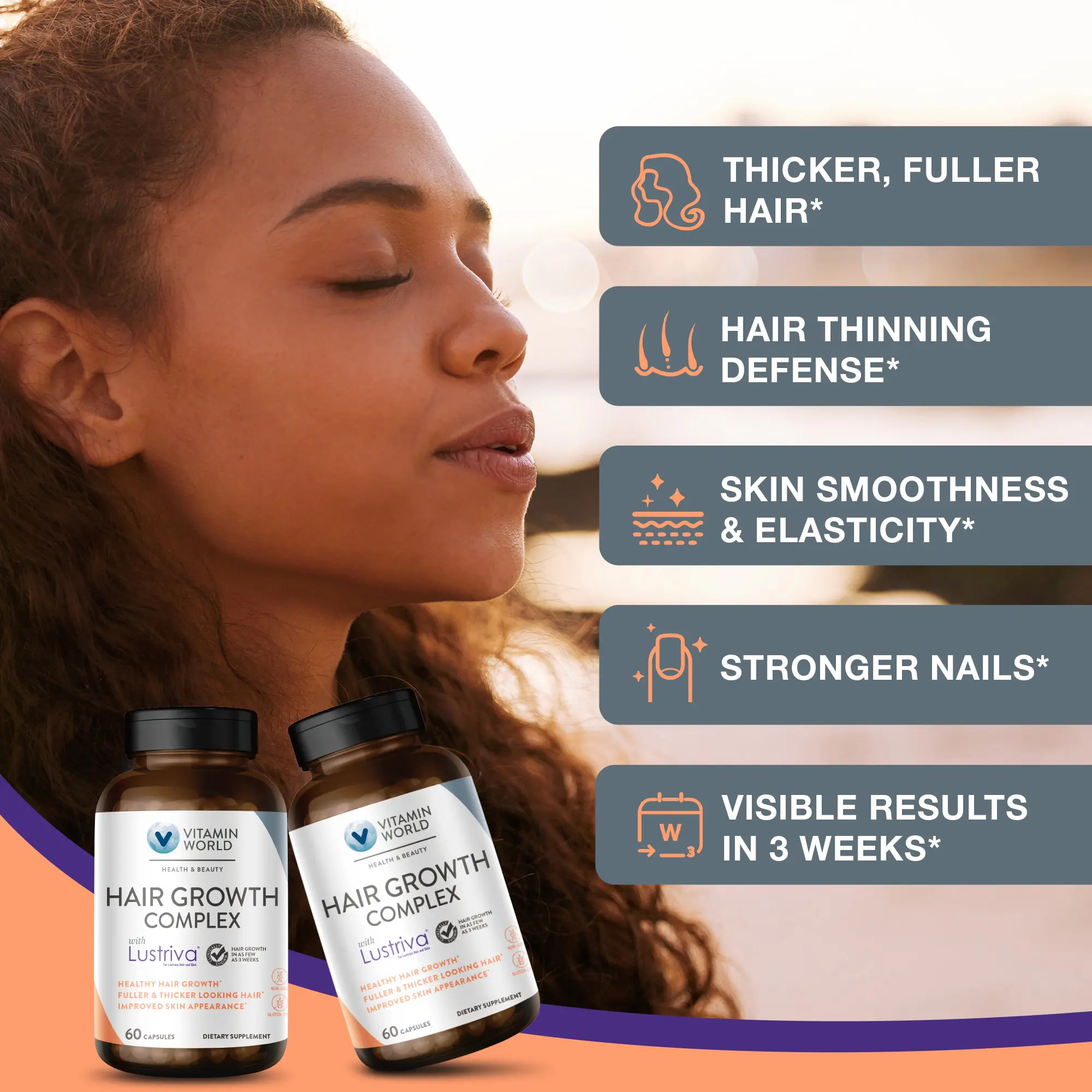3 weeks to fuller hair! Vitamin World Hair Growth Complex with Lustriva is a next-generation beauty-from-within formula designed to visibly improve hair thickness, skin texture, and nail strength in as little as 3 weeks!*