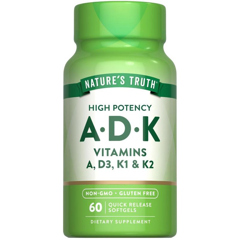 Get three daily vitamins in the ease of a single quick release softgel with Nature’s Truth high potency A-D-K softgels! One per day is all you need and provides support from vitamin A as retinyl palmitate, vitamin D as D3 cholecalciferol, vitamin K1 as phytonadione, and vitamin K2 as MK-4 and MK-7.