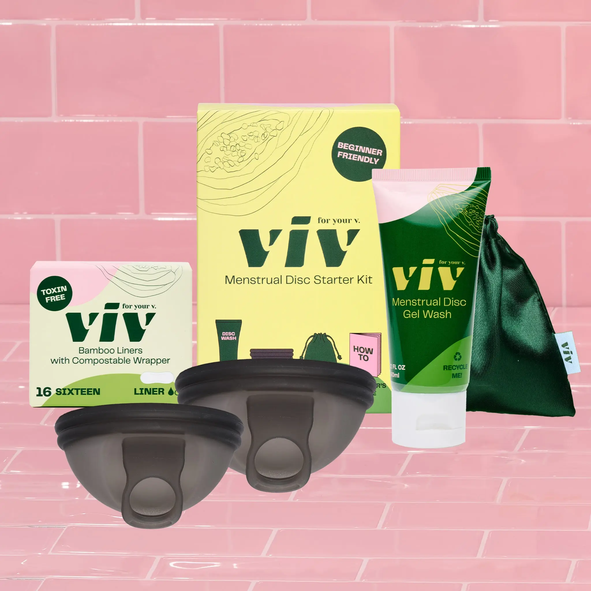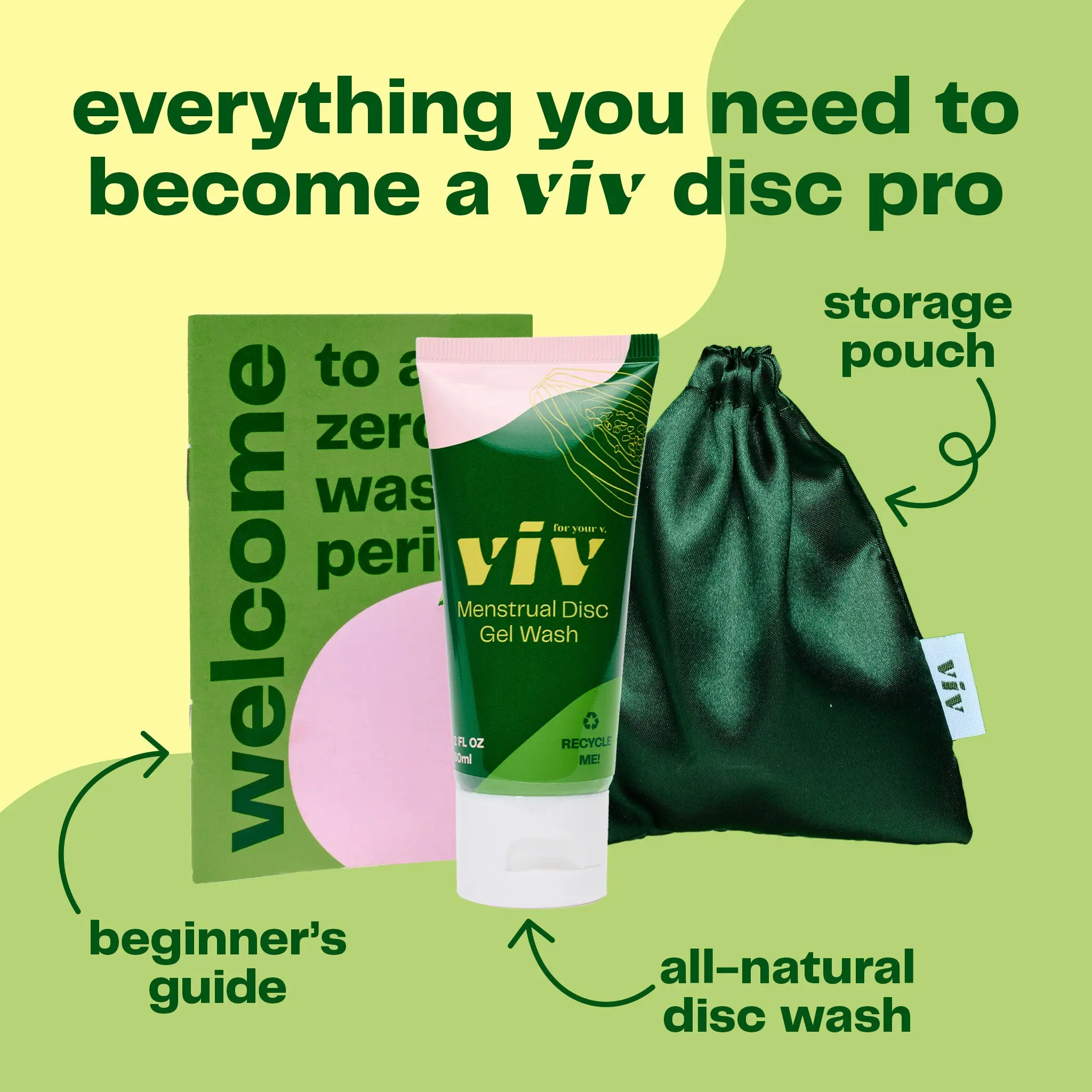 Includes: 2 viv menstrual discs (size S/M and size L), 2 fl oz all natural viv disc wash, storage pouch, disc beginner's guide, and 16 viv liners