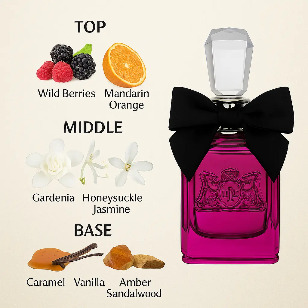 Top Notes: Wild Berries, Mandarin Orange. Middle Notes: Gardenia, Honeysuckle, Jasmine. Base Notes: Caramel, Vanilla, Amber, Sandalwood. Launched in 2013, this perfume captures the essence of femininity with its blend of berries, mandarin, honeysuckle, gardenia, jasmine, amber, caramel, vanilla, and sandalwood.