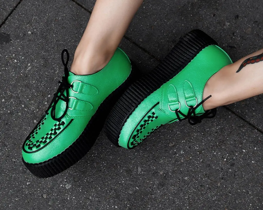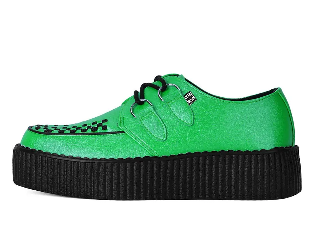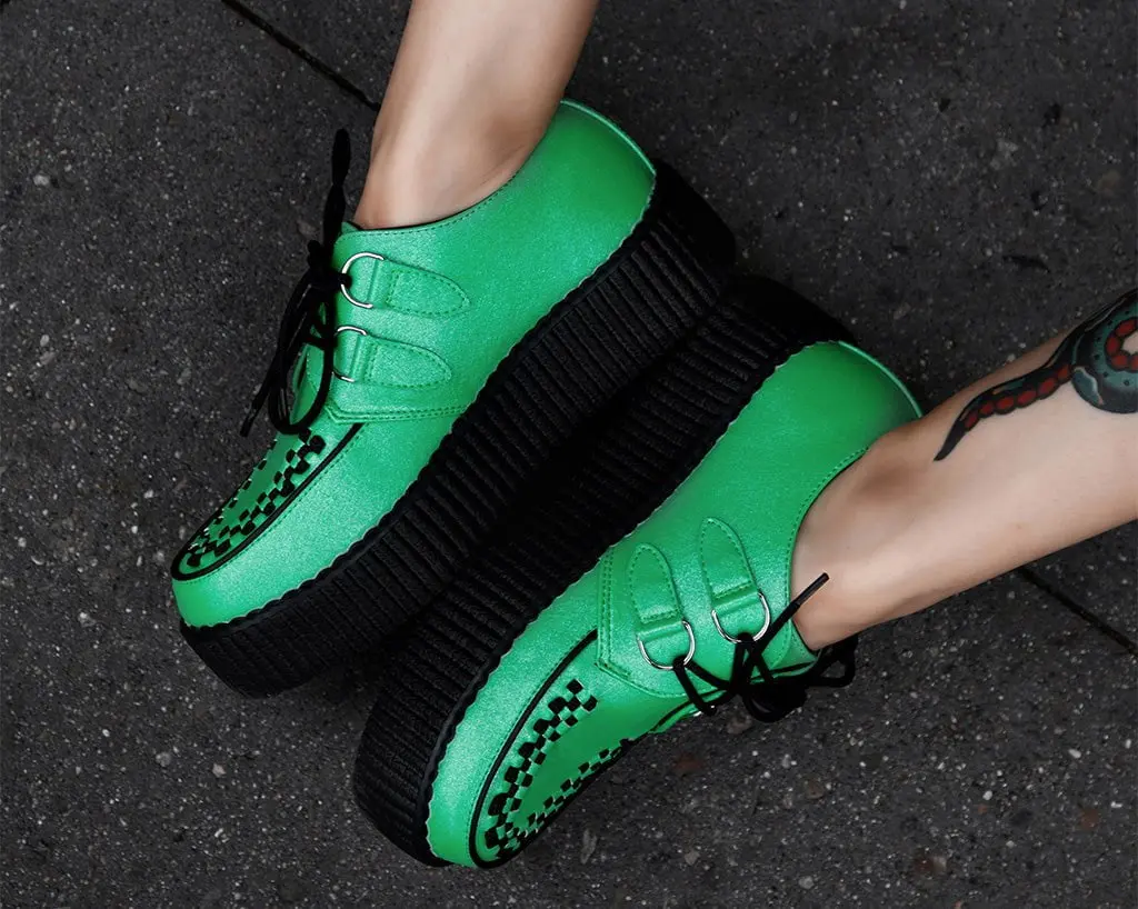Out-of-this-world style in the Green Metallic Viva Mondo Creepers. Its vegan-friendly green metallic upper and punk-inspired design will have you turning heads, while its platform sole adds a touch of fashion-forward appeal. Sits on our lightweight VIVA mondo sole that is approximately 1 ¾” at the heel and 1 ¼” in the front. Has removable memory foam padding for added comfort.
