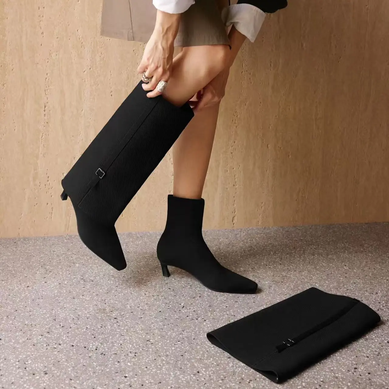 Rita, the high-heeled boot, redefines seasonal styling with its versatile 2-in-1 design. The knitted sleeve leg warmers let you switch effortlessly between sleek tall boots and refined ankle boots. This adds variety and elegance to any autumn-winter wardrobe. The stretchy knitted leg warmers hug your legs, while the stable mid heel and mini square toe offer structure and ease.