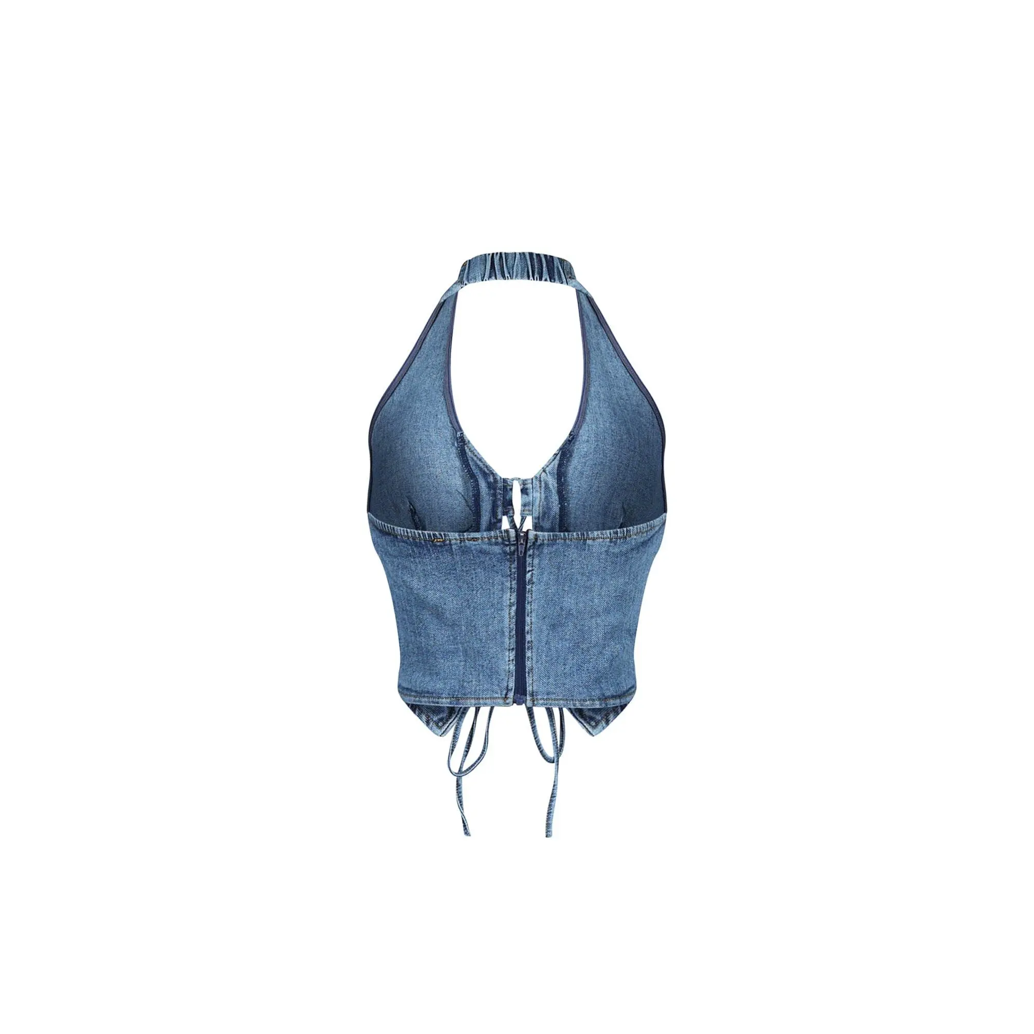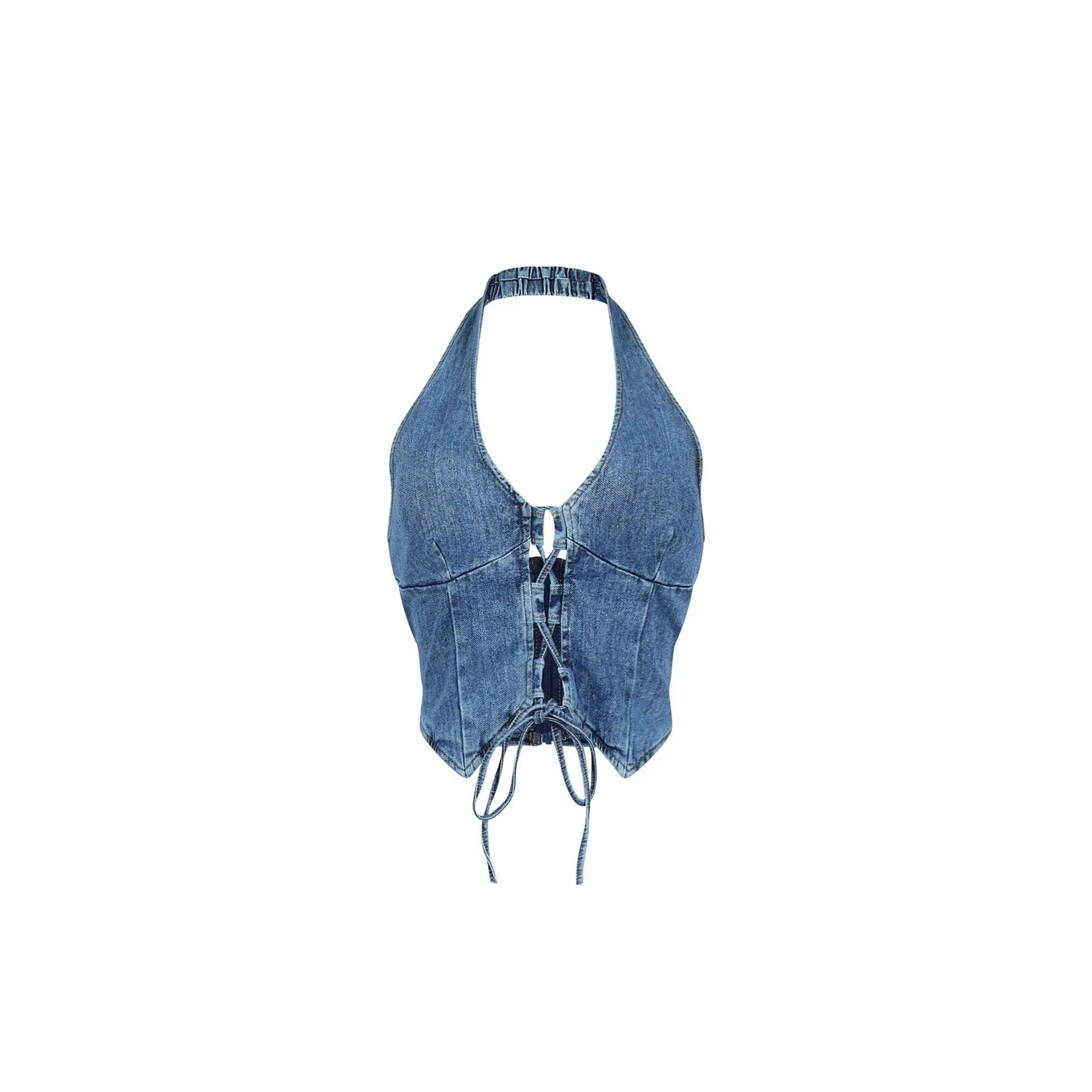 Sleeveless halter V neck backless denim vest featuring a lace up front and a pointed hemline for a sharp