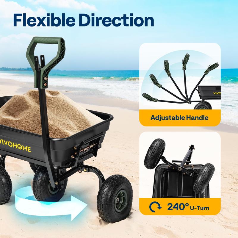 ·Quick and Easy Installation: The wagon features a 90° quick-dump mechanism for smooth and effortless unloading of heavy materials like dirt, leaves, or wood chips; It also offers a simplified steel frame that assembles quickly without tools, saving you time and effort