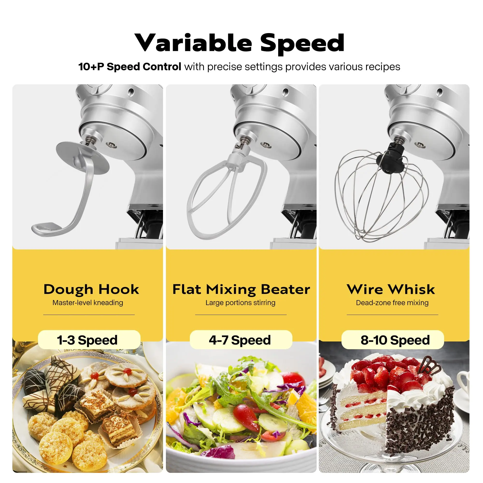 With 10+ speed control settings, this mixer adapts to various recipes. Lower speeds 1-3 are great for mixing yeast dough or mashing salads. Mid-range speeds 4-7 work well for cookie dough or beating egg whites. Higher speeds 8-10 are perfect for whipping and making meringues. The pulse function delivers short bursts of power.