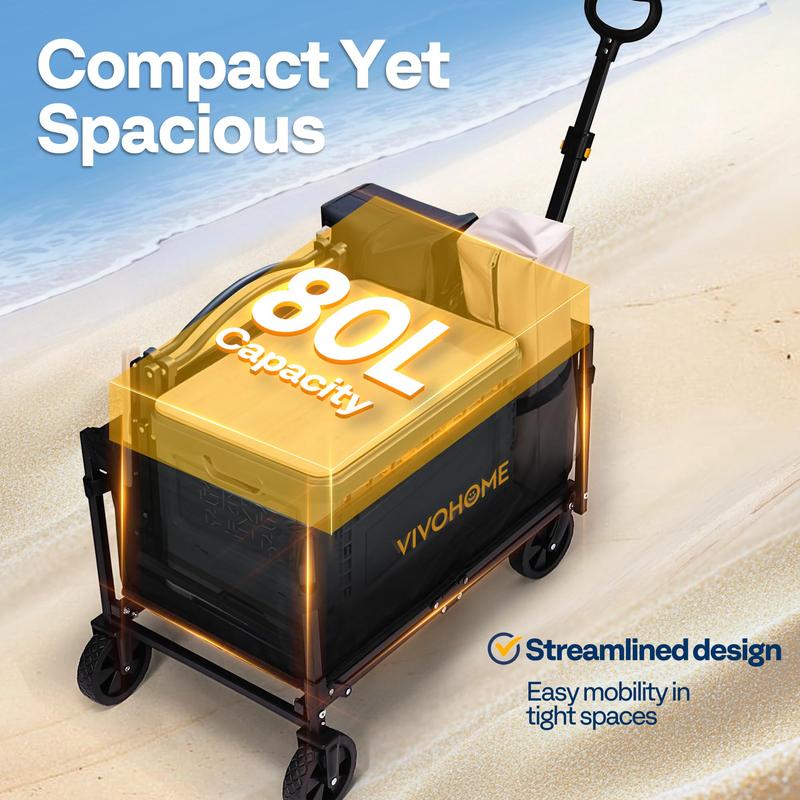 This wagon boasts an 80-liter capacity, ideal for carrying various items. The main basket provides ample room for household essentials, gardening tools, or outdoor gear. Its streamlined design without side pockets allows for easy navigation through tight spaces. Carry everything you need with ease.