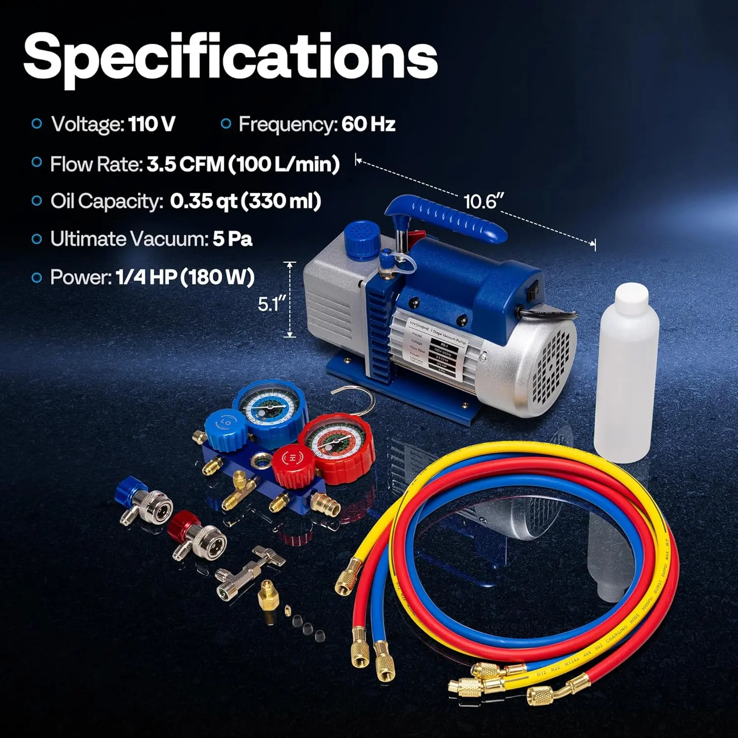 ·COMPLETE KIT FOR IMMEDIATE USE: This vacuum pump kit includes a 3.5 CFM vacuum pump, manifold gauge set, 3 color-coded 3000 PSI hoses, R134a quick couplers, 1 × 1/4"M to 1/2"F adapter, 1 × R134a self-sealing can tap and a bottle of 0.35 qt vacuum oil