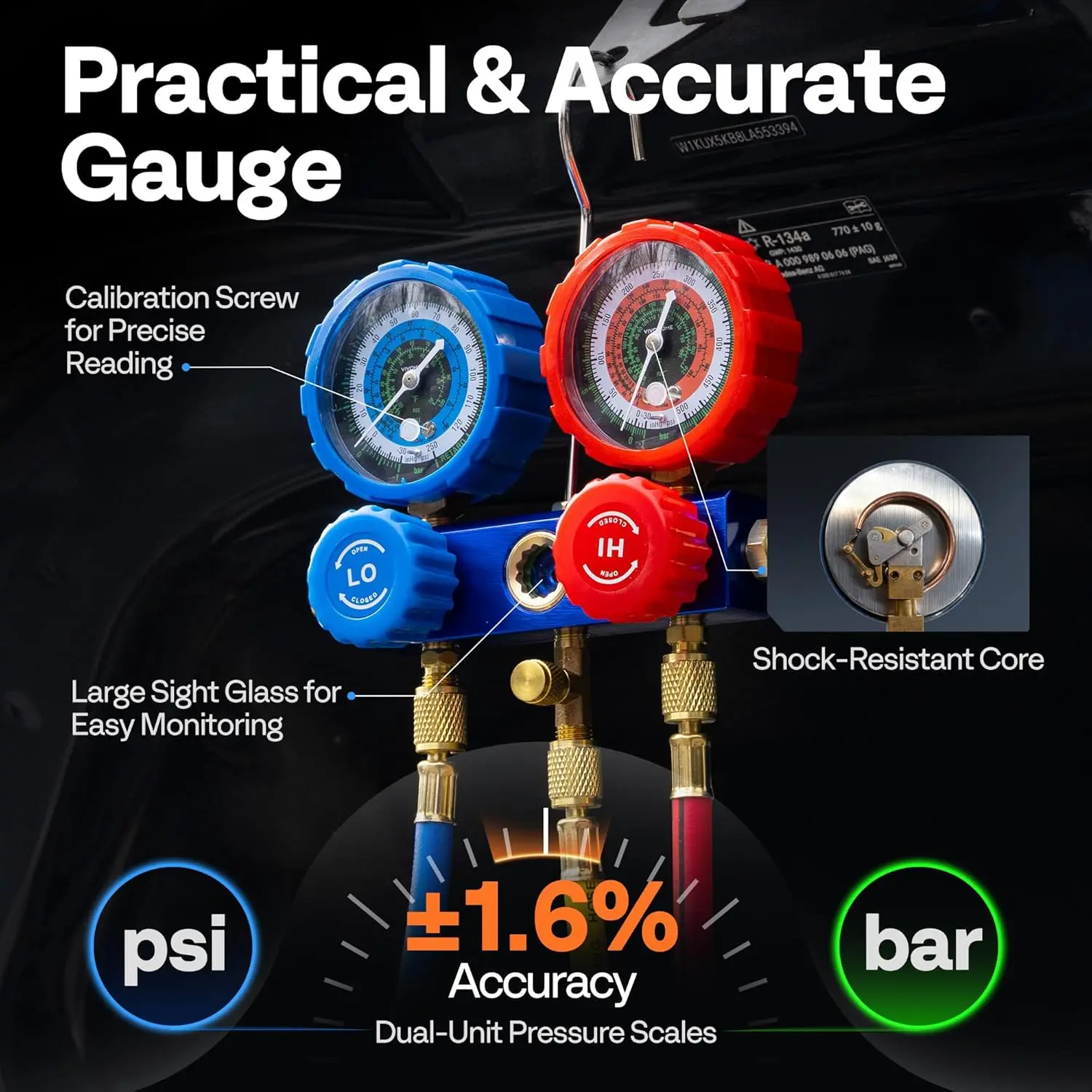 ·PRACTICAL & ACCURATE MANIFOLD GAUGE: The included manifold gauge provides ±1.6% accuracy with clear dual-unit scales and large sight glasses; Shock-resistant core, protective rubber cover, and built-in hanging hook support dependable diagnostics