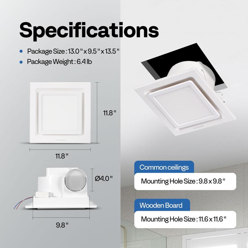 ·SIMPLE INSTALLATION: All necessary hardware and a clear manual are included for easy installation; The one-piece design exhaust fan is pre-assembled, you only need to install it according to the instructions and plug in the power supply to use; Suitable for common ceilings Mounting Hole Size: 9.8 x 9.8 in(L x W); Wooden Board Reinforcement mounting Hole Size: 11.6 x 11.6 in(L x W); Duct Diameter: Ø4.0 in, Panel size 11.8 x 11.8 in(L x W)