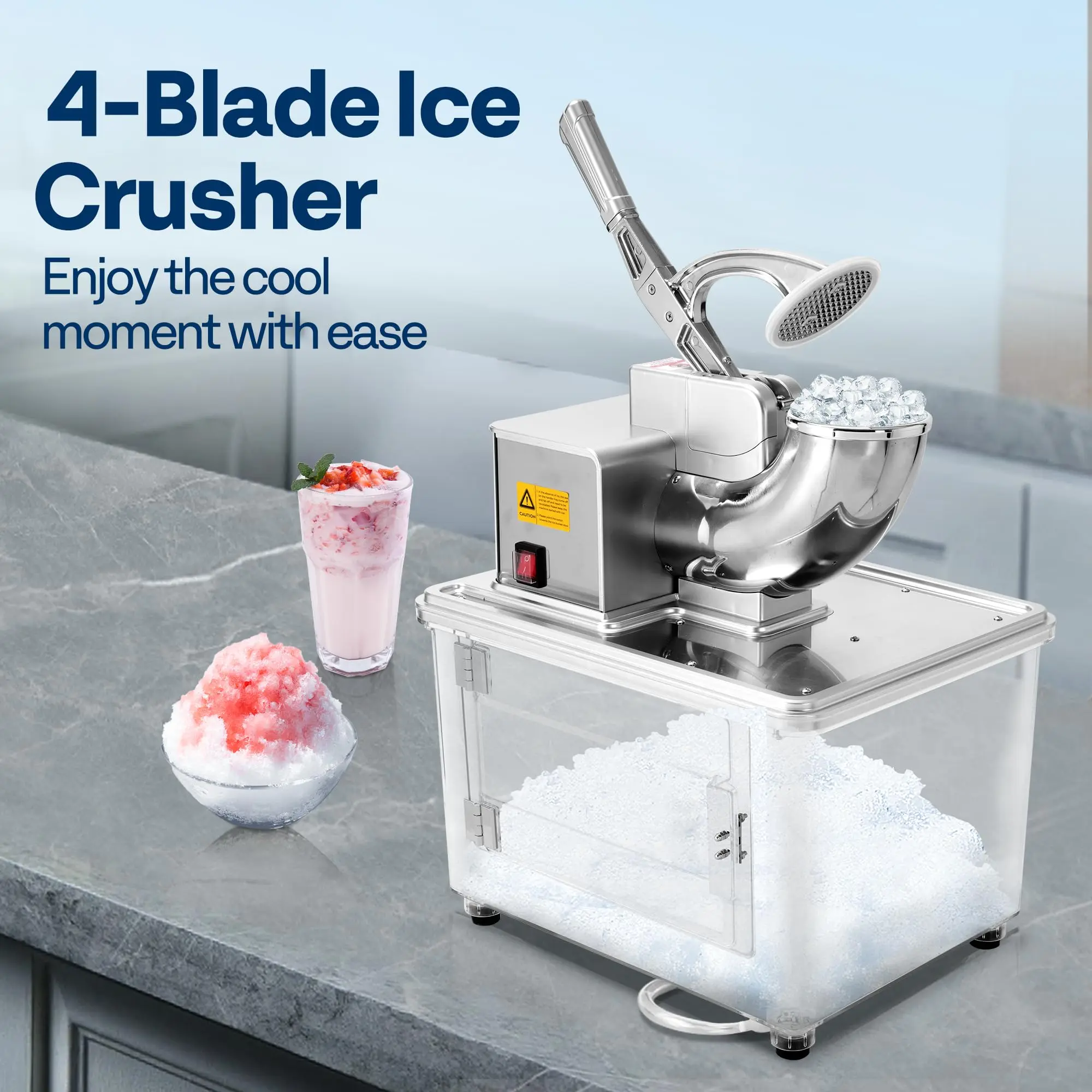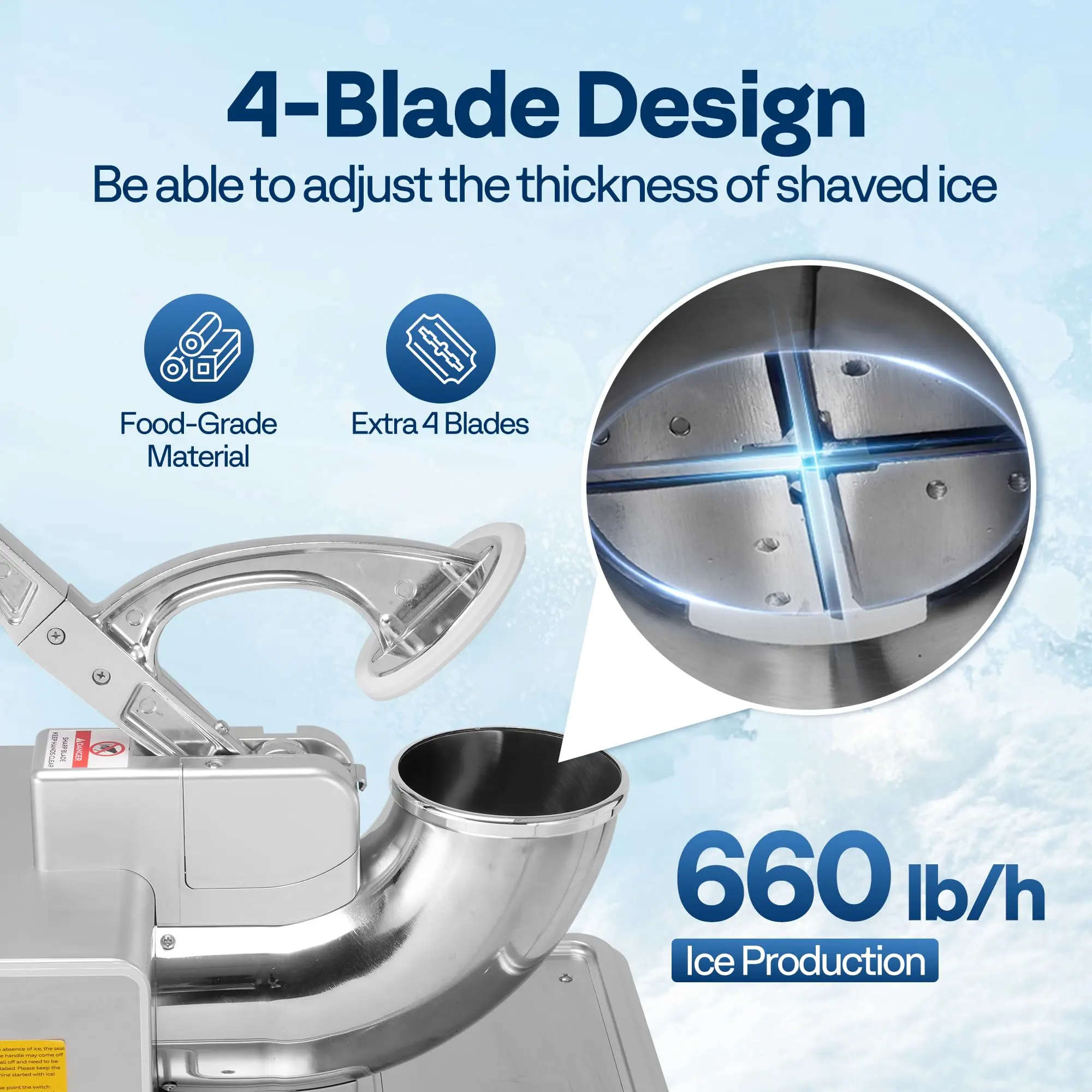 Equipped with a 350W copper motor and 1450 RPM speed, this machine crushes ice at a rate of 660 lbs/hr. Four blades work together for efficient ice crushing. The adjustable blades allow you to control the thickness of the shaved ice, ensuring perfect results every time.