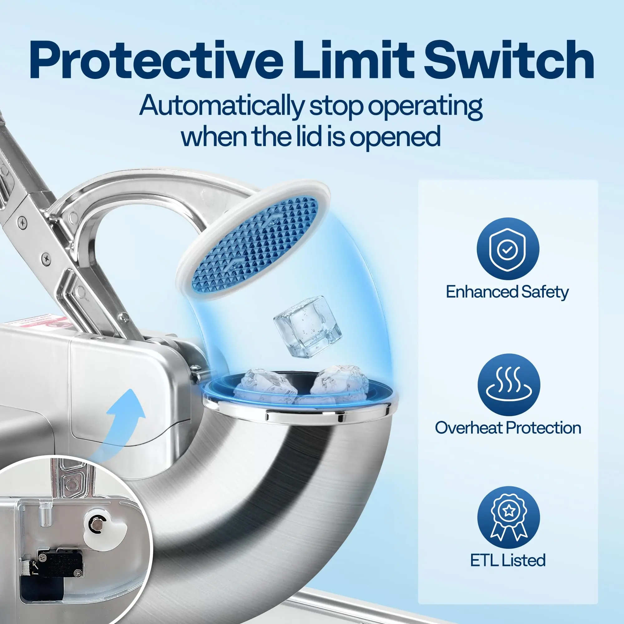 A limit switch automatically halts operation when the lid is opened, ensuring safety. The overheat protection system provides safer, more reliable performance. A waterproof switch and non-slip feet add extra safety and stability.