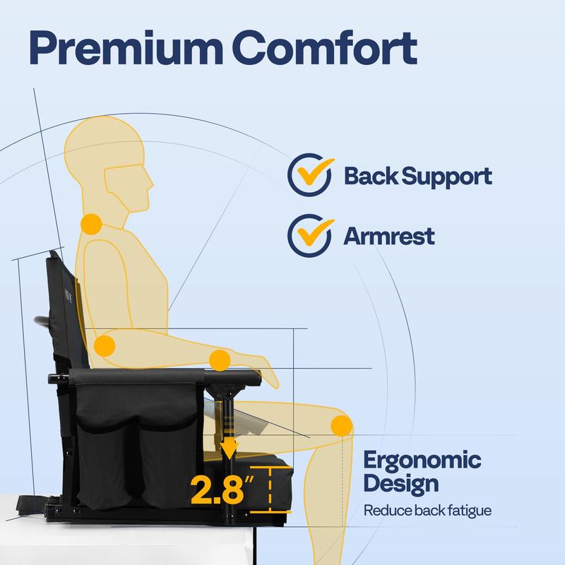 WIDE SEAT & THICK CUSHION: The 18.5-inch-wide stadium chair, with a seat depth of 15.4 in, comfortably accommodates most individuals; The 2.8-inch-thick high-density sponge cushion offers exceptional support, reduces fatigue from prolonged sitting, and retains its shape