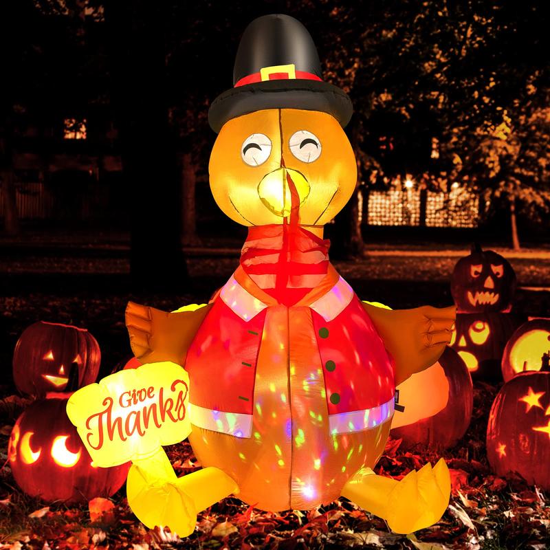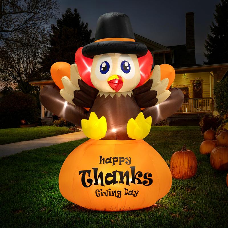 The VIVOHOME Happy Thanksgiving Inflatable LED Lighted Turkey is ideal for your outdoor lawn and yard. This family-friendly blow-up turkey adds a festive touch to your celebration. Its LED lights create a warm, inviting glow, making it a standout feature. Bring the joy of Thanksgiving to life with this charming decoration.