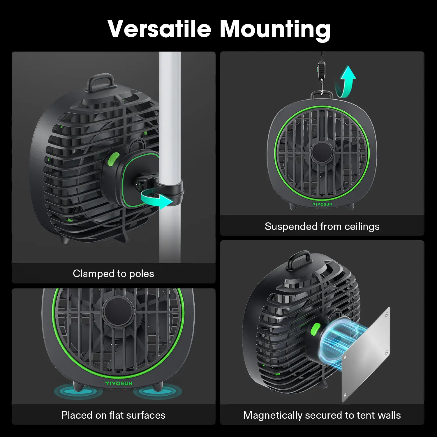 Choose from four mounting options - flat surface placement, pole clamping, ceiling suspension, or magnetic attachment to tent walls using an external iron plate